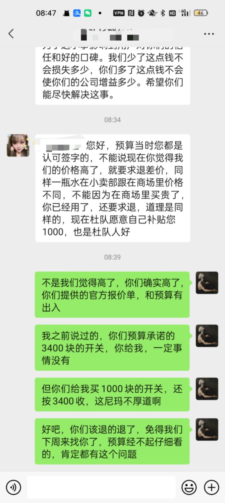 約定退回差價,拖了小半年未果,目前交涉只愿意賠付一半的差價1000,且非裝修公司出面,由工頭出錢