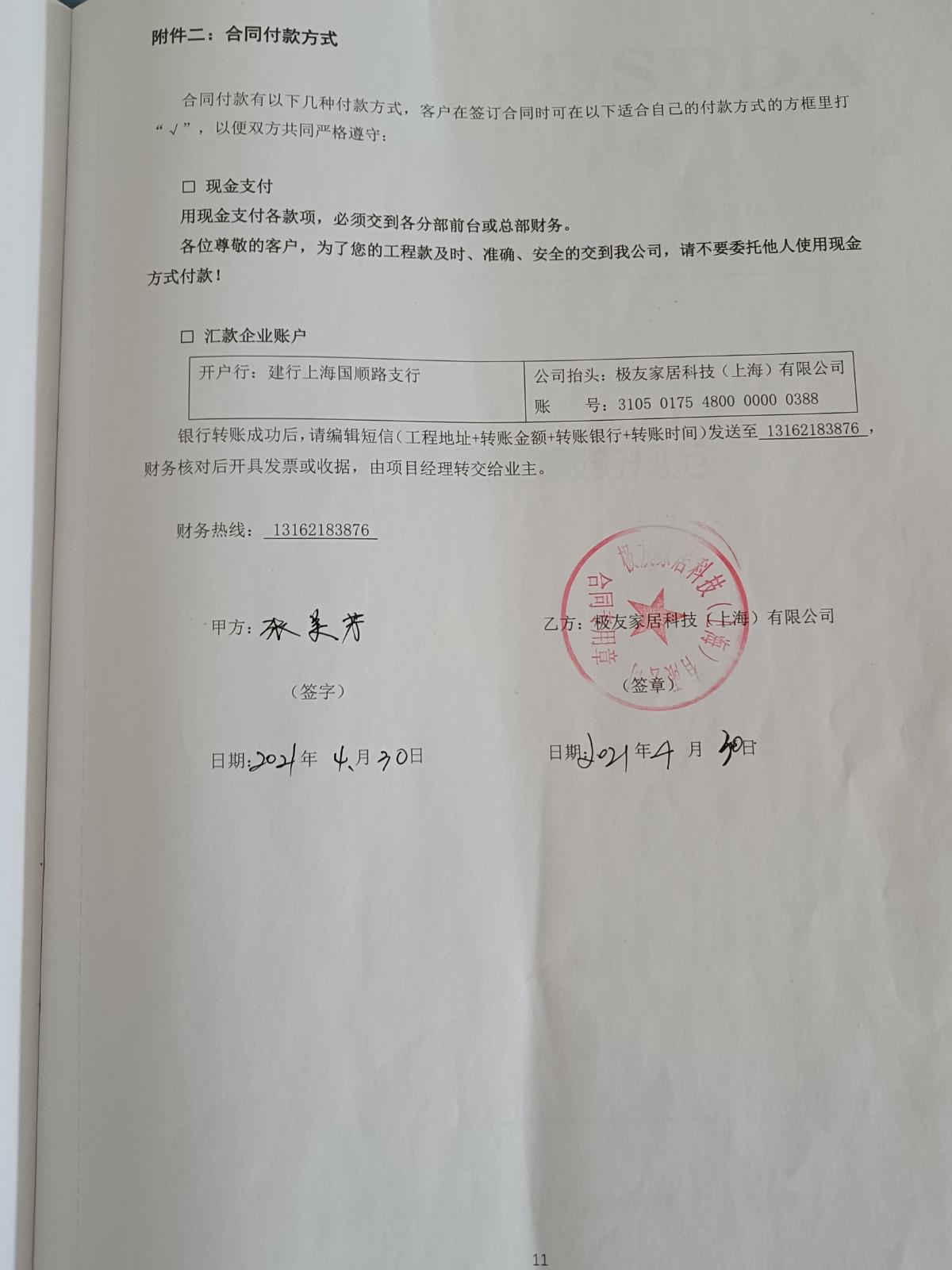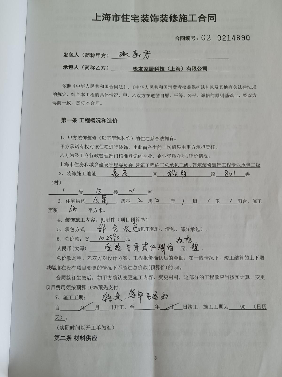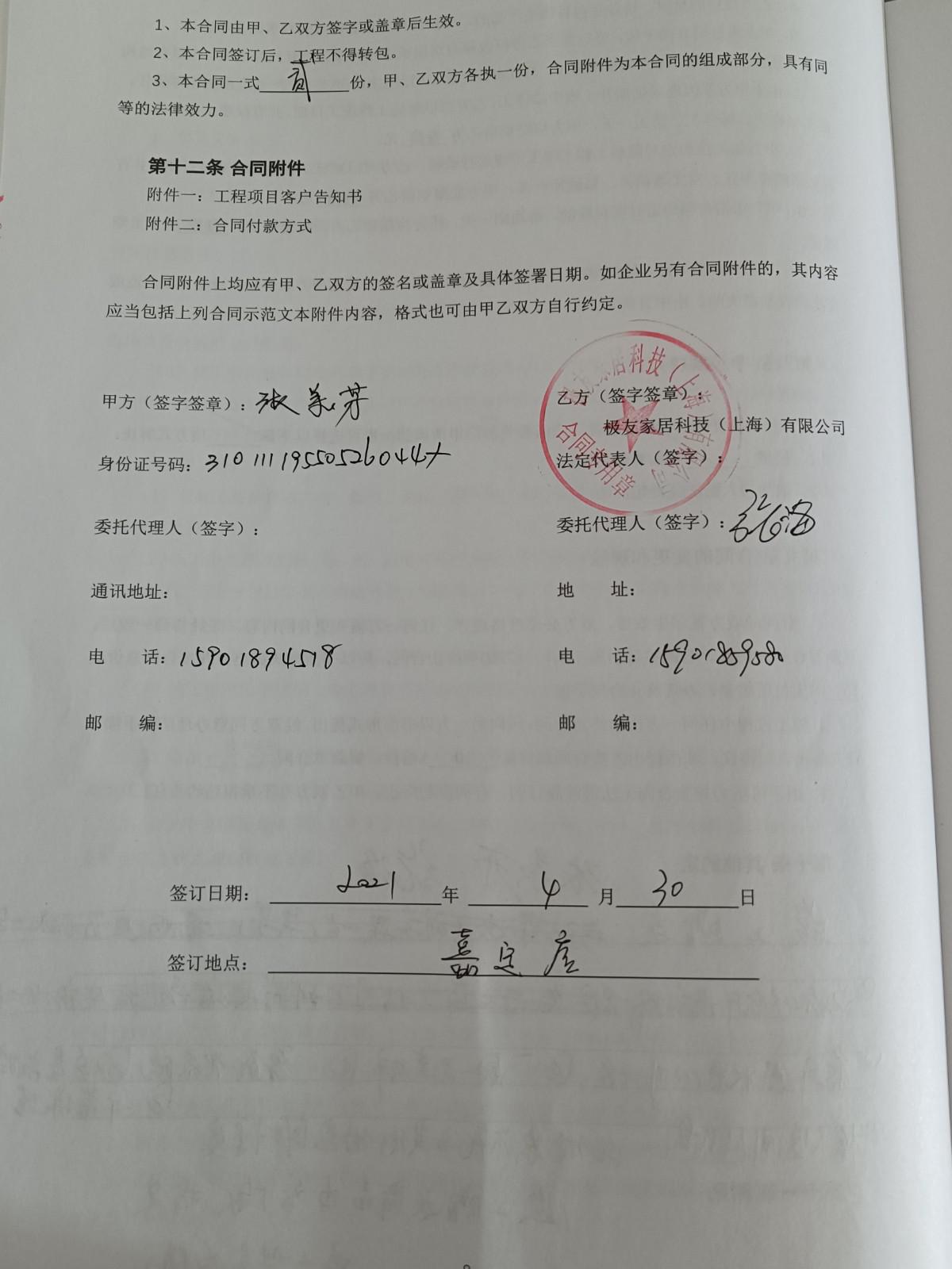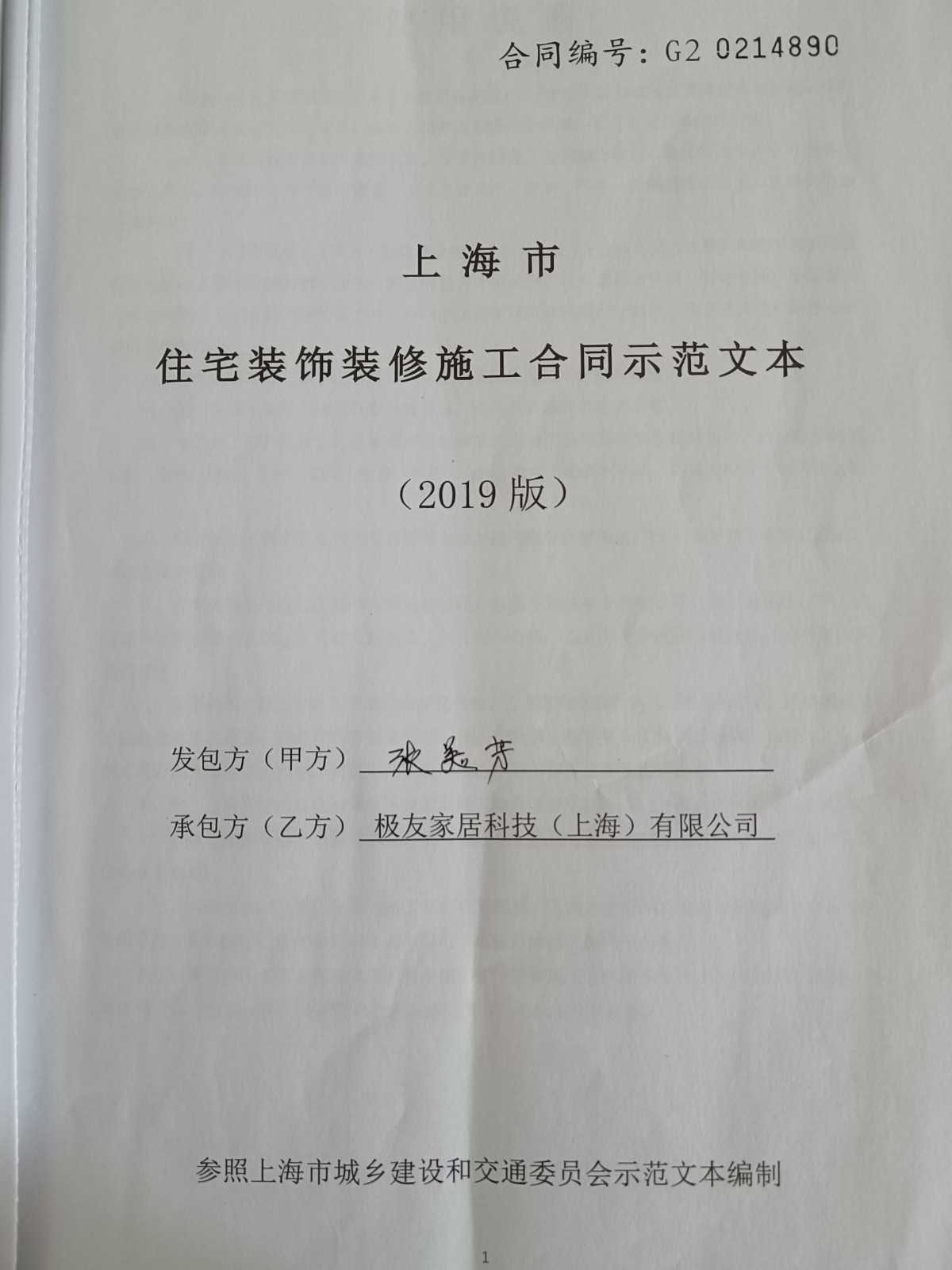 2021年4月30日,我們與極友家居簽訂了整裝合同,將上海市嘉定區(qū)安亭鎮(zhèn)淞陽路801弄1號1502室交由其進(jìn)行裝修。
