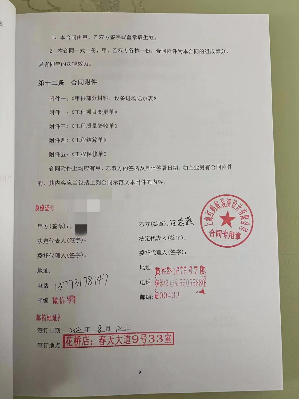 本人與上海紅螞蟻裝潢設(shè)計(jì)有限公司花橋分公司(后面簡稱紅螞蟻)在2022年08月12日簽訂了裝修合同。