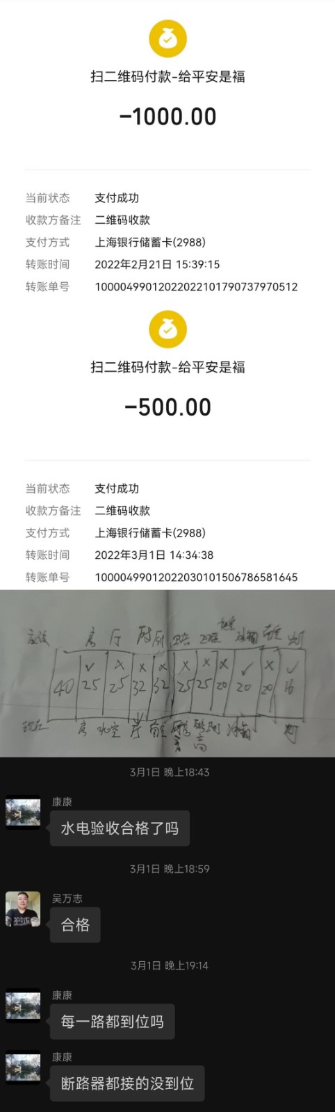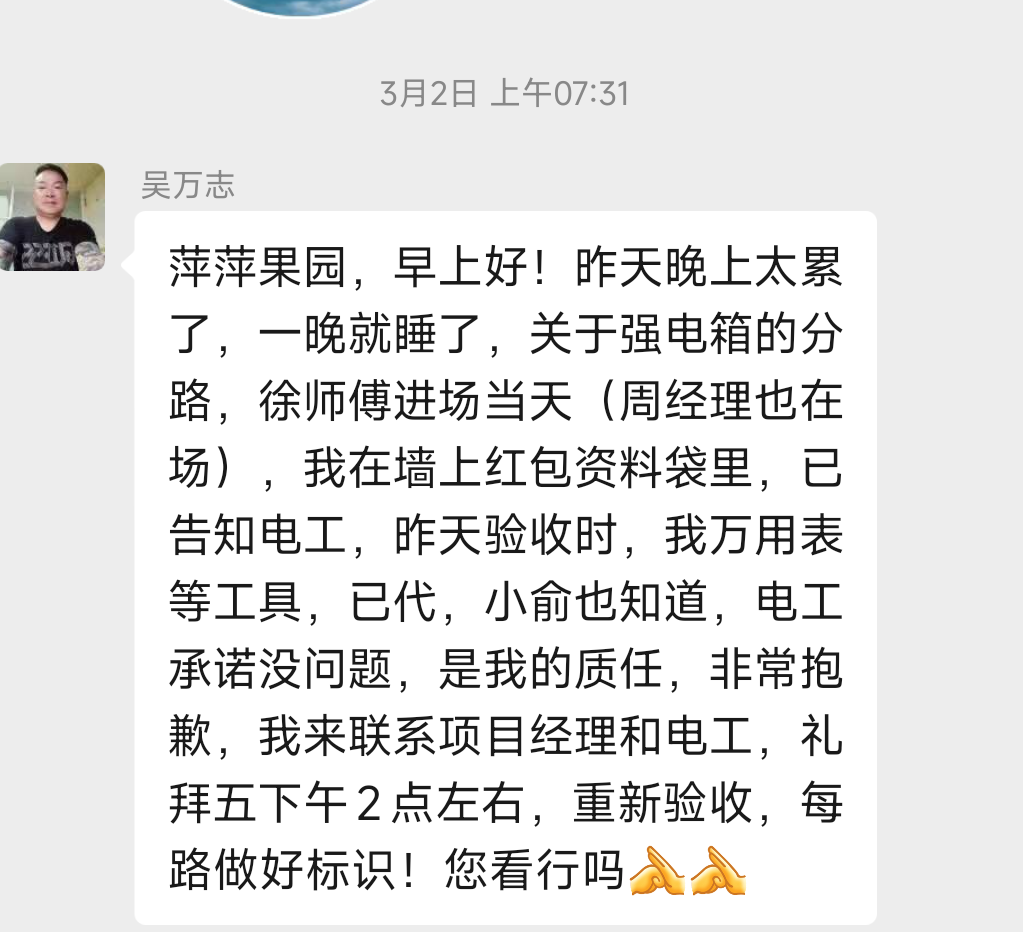 水電驗(yàn)收當(dāng)天,尚高派來(lái)的監(jiān)理吳萬(wàn)志態(tài)度極其敷衍,沒(méi)有進(jìn)行任何的水路電路檢查就說(shuō)驗(yàn)收通過(guò)。直到當(dāng)天晚上我們指出斷路器分路的問(wèn)題后,他才在微信群中承認(rèn)是他輕信了電工沒(méi)問(wèn)題的承諾,是他的的責(zé)任,且承諾進(jìn)行第二次驗(yàn)收,但時(shí)至今日我們也沒(méi)等到第二次驗(yàn)收。(圖十四)