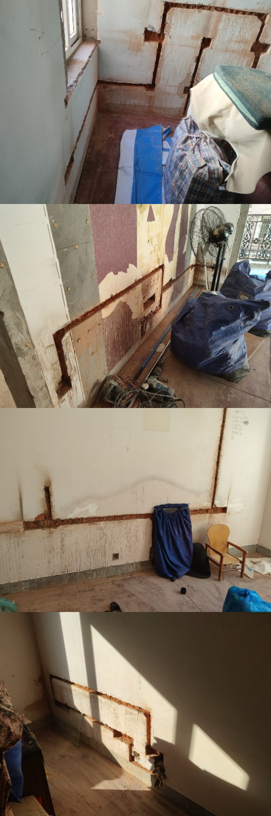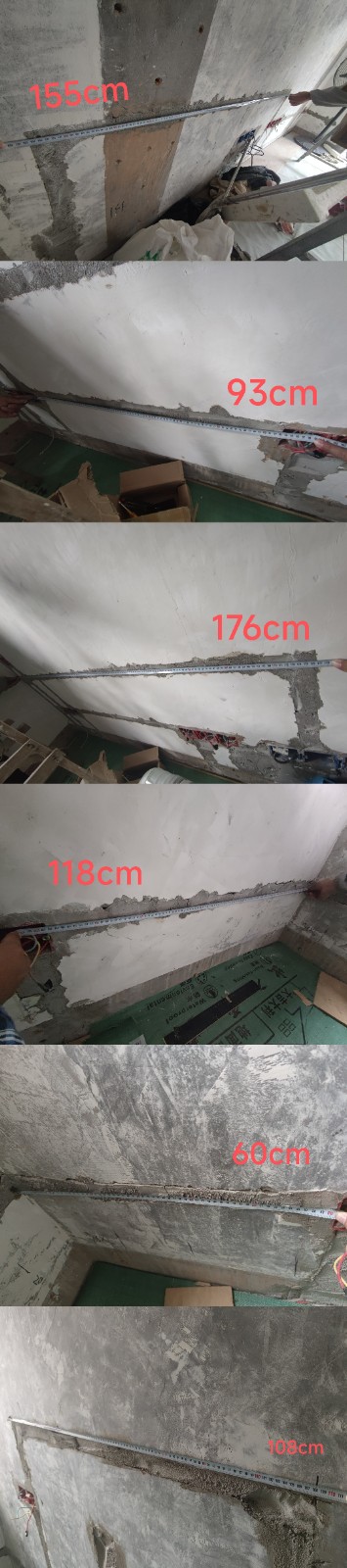 由于保留原先房屋地面的龍骨與木板且房屋時(shí)間較老,所以我們?cè)谠O(shè)計(jì)與簽訂合同時(shí)與設(shè)計(jì)師多次強(qiáng)調(diào)強(qiáng)電弱電可以沿著墻邊以及石膏線走,千萬(wàn)不要開長(zhǎng)距離的橫槽。但實(shí)際開工后,在設(shè)計(jì)師未與我進(jìn)行水電定位的情況下,施工工人擅自對(duì)房屋多處開大量長(zhǎng)距離的橫槽,有些墻甚至兩面都開了長(zhǎng)距離橫槽,嚴(yán)重影響房屋墻面的安全性,也使得墻面后期更容易開裂。