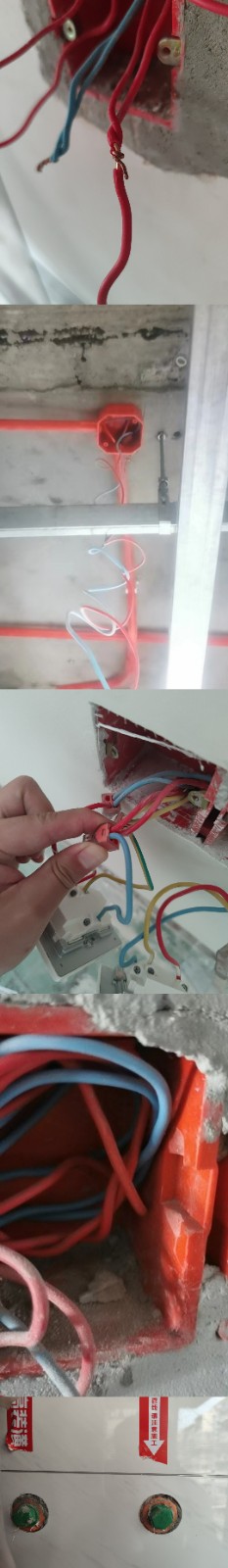 (3) 除此之外,在后續(xù)我們自己的檢查中還發(fā)現(xiàn)了包括部分電線使用了膠帶纏繞沒(méi)用接線端子并線、八角盒全部沒(méi)有安裝蓋板和阻燃型塑料軟管、底盒中火線零線并線錯(cuò)誤、開關(guān)盒全部未使用保護(hù)蓋保護(hù)致使部分底盒出現(xiàn)損壞、熱水器進(jìn)出水口不在一條水平線上等等諸多問(wèn)題。(圖八)