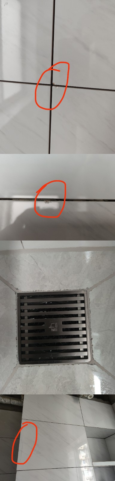 (6) 瓷磚有大量崩瓷現(xiàn)象,地漏處瓷磚切割坑坑洼洼,壁龕處有一塊瓷磚有很長(zhǎng)的裂縫(圖十一)