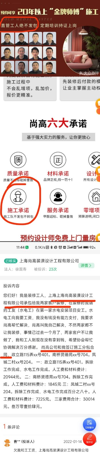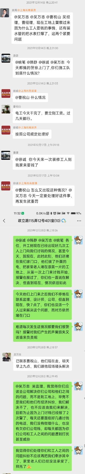 尚高廣告上承諾直管工人,施工隊(duì)絕不發(fā)包轉(zhuǎn)包,但實(shí)際上來(lái)我家施工的第一任項(xiàng)目經(jīng)理曹祝山不僅找來(lái)的工人施工毫無(wú)規(guī)范質(zhì)量可言,事后我們從他在行業(yè)協(xié)會(huì)這里的網(wǎng)絡(luò)投訴才知道是因?yàn)樗麤](méi)錢支付工人費(fèi)用才導(dǎo)致了當(dāng)初在水電并沒(méi)有完工且完全達(dá)不到驗(yàn)收標(biāo)準(zhǔn)的情況下,先后三次工人上門問(wèn)我們討要工錢,最惡劣一次發(fā)生在2021年12月28日,此時(shí)已更換項(xiàng)目經(jīng)理,曹祝山糾集工人將我堵在家里長(zhǎng)達(dá)五個(gè)多小時(shí),天黑后還將總電表拉閘,我們當(dāng)時(shí)多次聯(lián)系尚高公司,請(qǐng)求他們解決,但無(wú)論是設(shè)計(jì)師還是號(hào)稱代表公司負(fù)責(zé)本項(xiàng)目的監(jiān)理,還是公司投訴電話,態(tài)度都及其敷衍,對(duì)此惡性事件均表示無(wú)能為力,最后我只能報(bào)警將他們驅(qū)離。