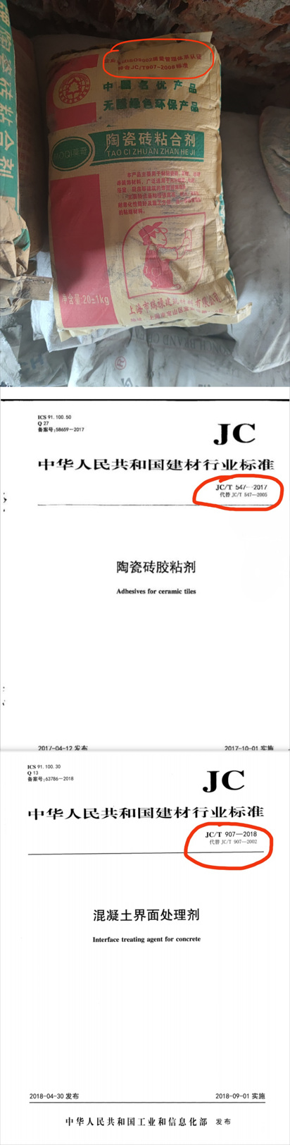 (5) 送來(lái)的瓷磚粘結(jié)劑疑似假冒偽劣產(chǎn)品,產(chǎn)品包裝上印的執(zhí)行標(biāo)準(zhǔn)不是國(guó)家規(guī)定的瓷磚粘結(jié)劑標(biāo)準(zhǔn)(圖十六)