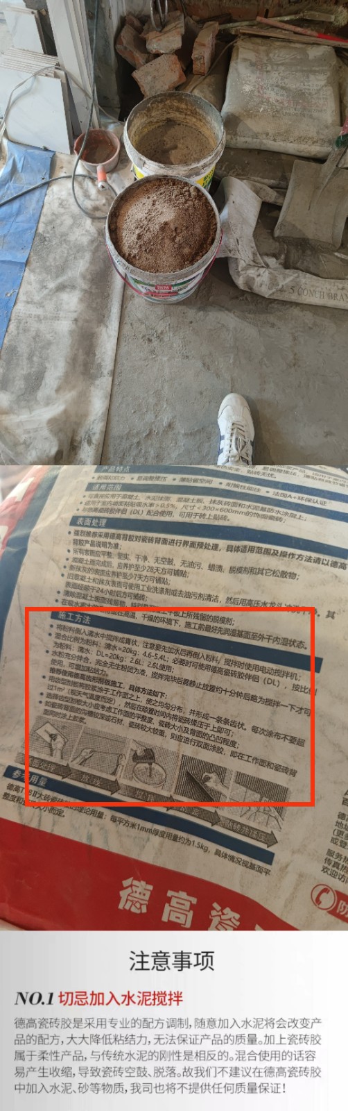 (5) 瓦工使用瓷磚粘結(jié)劑時(shí)不按產(chǎn)品官方使用說(shuō)明和施工方法,擅自添加黃沙水泥甚至還偷偷往里加洗潔精,破環(huán)瓷磚粘結(jié)劑粘性強(qiáng)度(圖十)