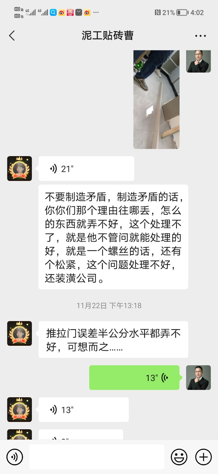我是曹致利,瓦工13815548899 老板江加蔣17717308537工地在今年九月二十三號(hào)到達(dá)工地的,十月十五日結(jié)束的,其中國(guó)慶節(jié)回家趟,放假期間不讓干,前后加班不算干了十六天,結(jié)束回家他也沒回答我什么時(shí)候結(jié)工錢,現(xiàn)在年底向他要錢了,又說這樣毛病那樣毛病總共6700塊錢,在哪里付了5千余下的一千七百塊錢就不想把了,我微信聯(lián)系他他說沒錢了,工地在松江區(qū)九亭三盛頤景園282號(hào)401室,一般一都是人走門帳清的,哪曉得他故意留下一千七就是個(gè)陷阱!