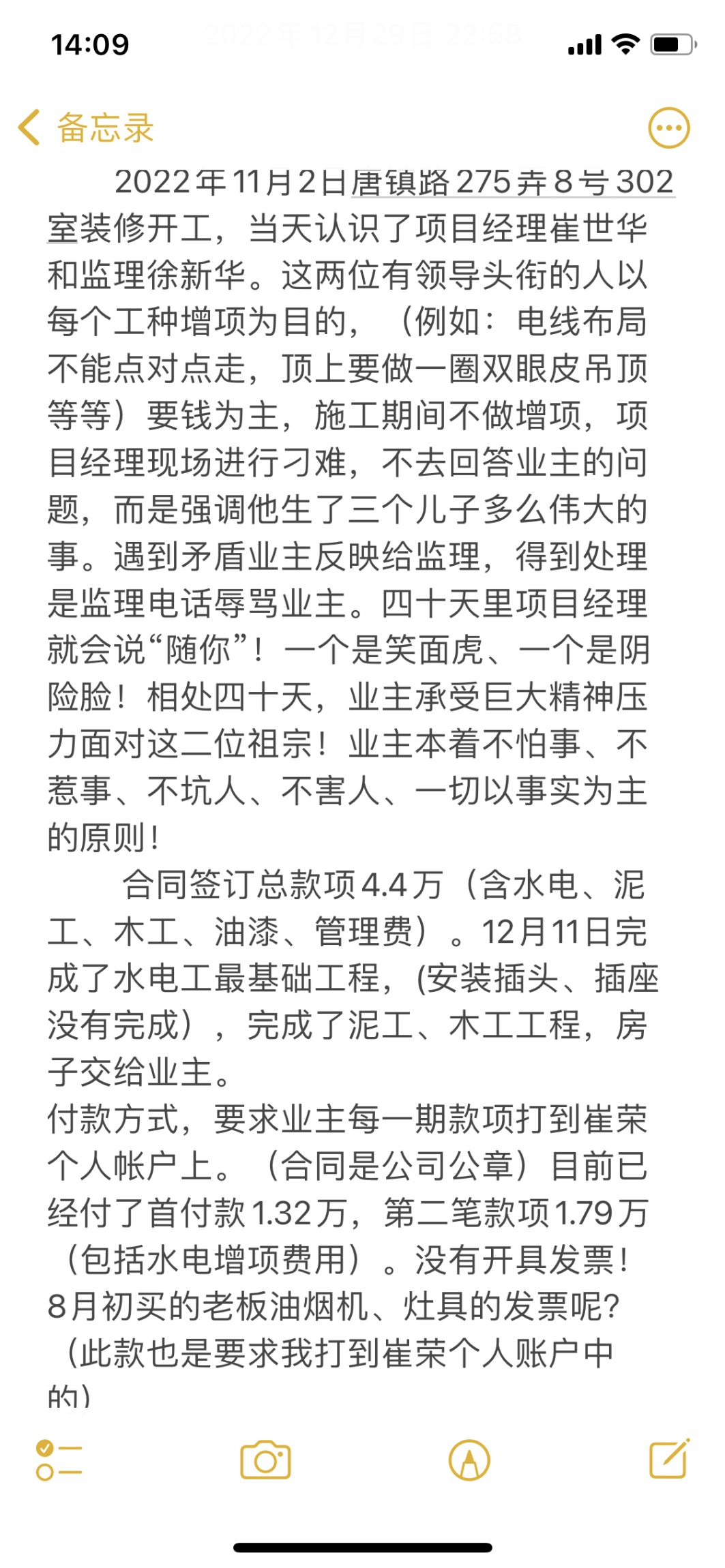 2022年11月1日我與鵬榮建筑設(shè)計(jì)中心簽訂裝修合同。四十天裝修遇到問題得不到幫助,得到的是刁難和辱罵。有的項(xiàng)目沒有做不扣除費(fèi)用,增項(xiàng)項(xiàng)目有重復(fù)計(jì)費(fèi)、有的是天價(jià)不符合實(shí)際米數(shù)和面積。請(qǐng)求老師幫助審價(jià)和核實(shí)!