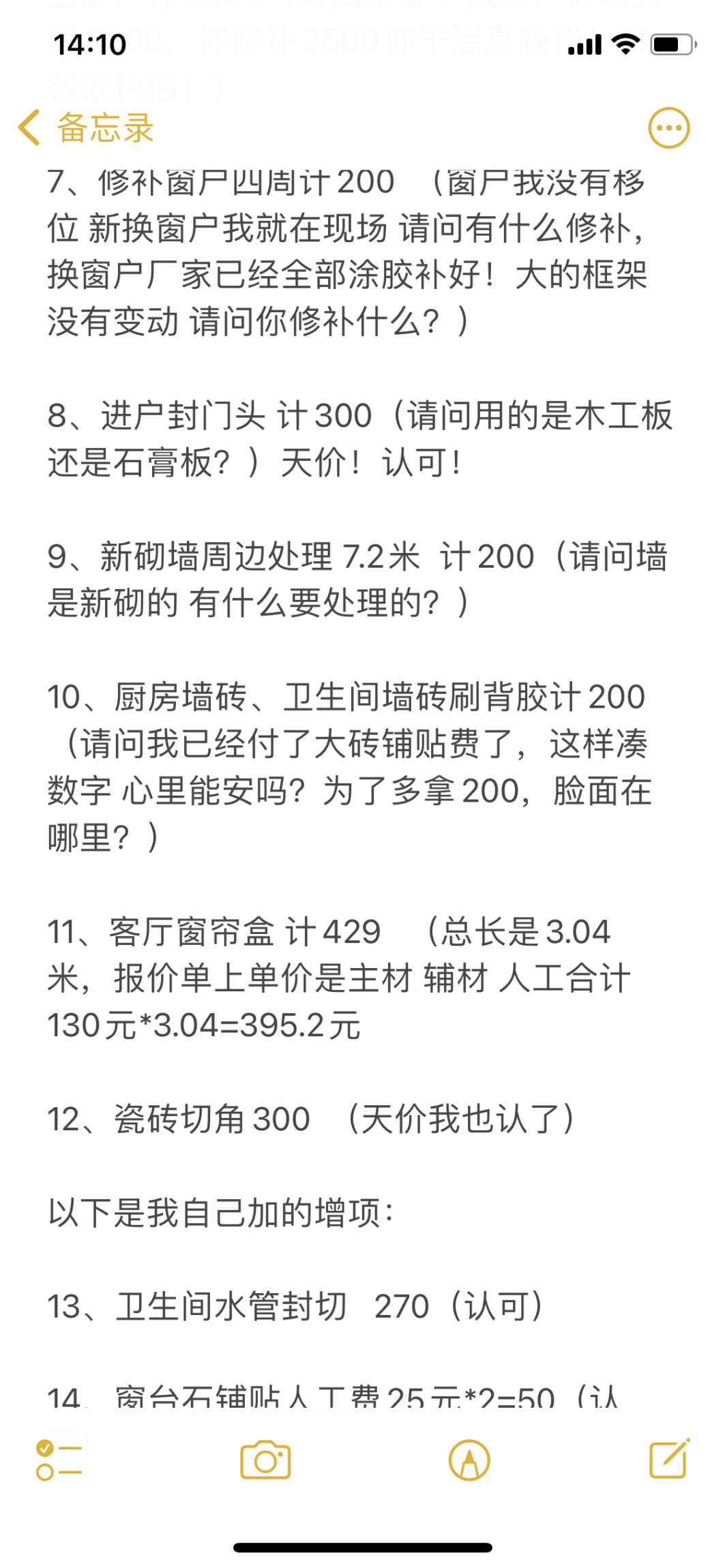 我已經(jīng)把具體減項(xiàng)明細(xì)和增項(xiàng)明細(xì)認(rèn)可和質(zhì)疑的地方發(fā)到施工群,希望得到對(duì)方反饋,但是沒有。還是一個(gè)勁的問我要錢。