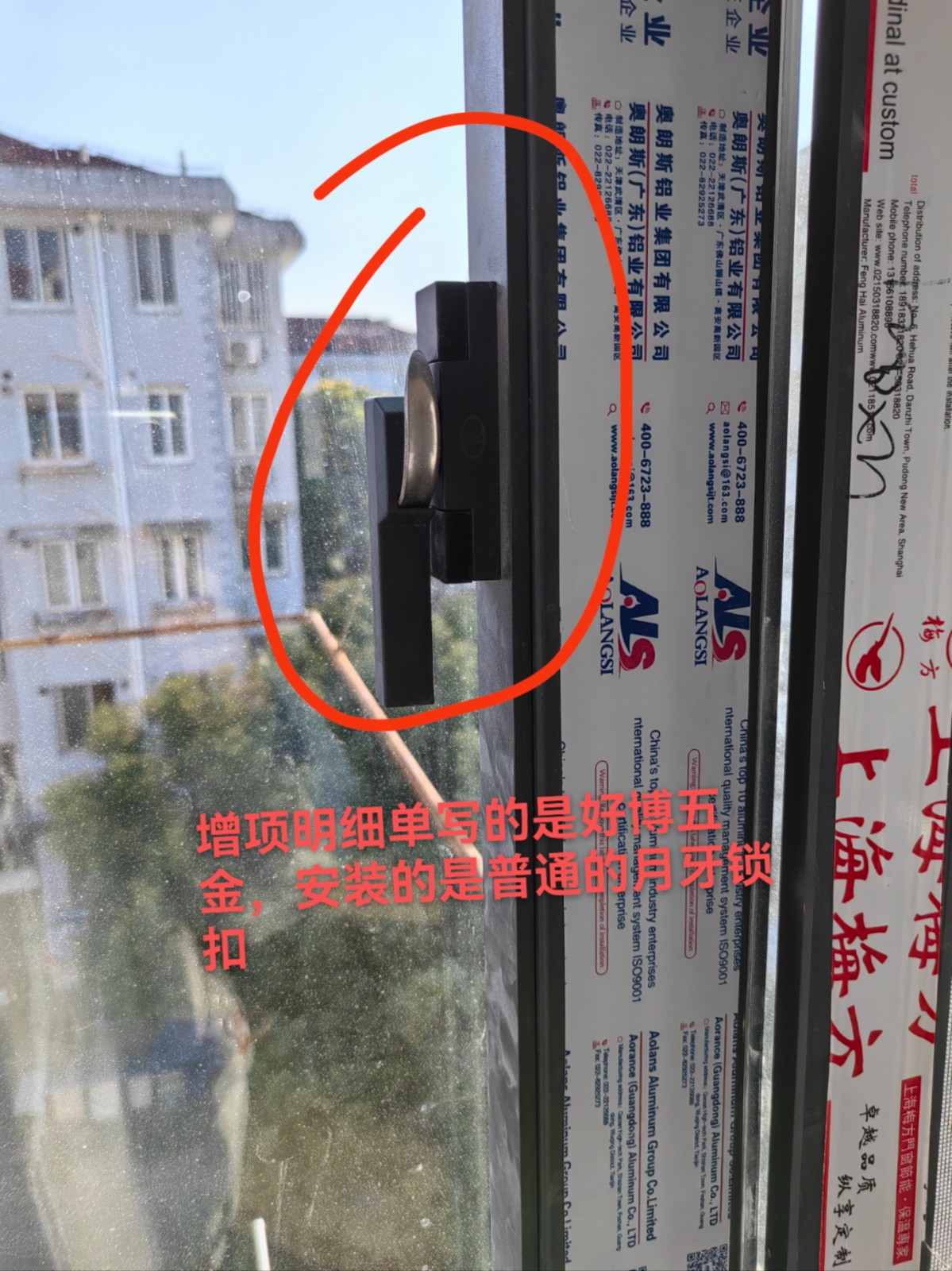二、窗戶增項白紙黑字寫了是好博的五金,乙方安裝的卻是普通的月牙鎖扣五金