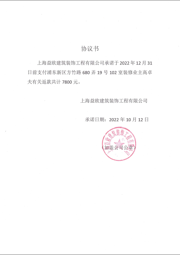 2022年10月5日與項(xiàng)目負(fù)責(zé)人常永俊核算退款事宜。裝修公司需向業(yè)主返還裝修費(fèi)用7800元。常永俊于2021年10月12日出具協(xié)議書,承諾于2022年12月31日前支付相應(yīng)返款7800元。根據(jù)合同第七條第九款“工程竣工驗(yàn)收合格后乙方應(yīng)在當(dāng)日內(nèi)辦理結(jié)算手續(xù)?!背鲇诤贤O(shè)立時(shí)的公平公正原則,業(yè)主不同意該承諾書內(nèi)容,電話與被告項(xiàng)目負(fù)責(zé)人常永俊協(xié)商。常永俊電話同意2021年11月15日前退還款項(xiàng),但始終未履行還款承諾。