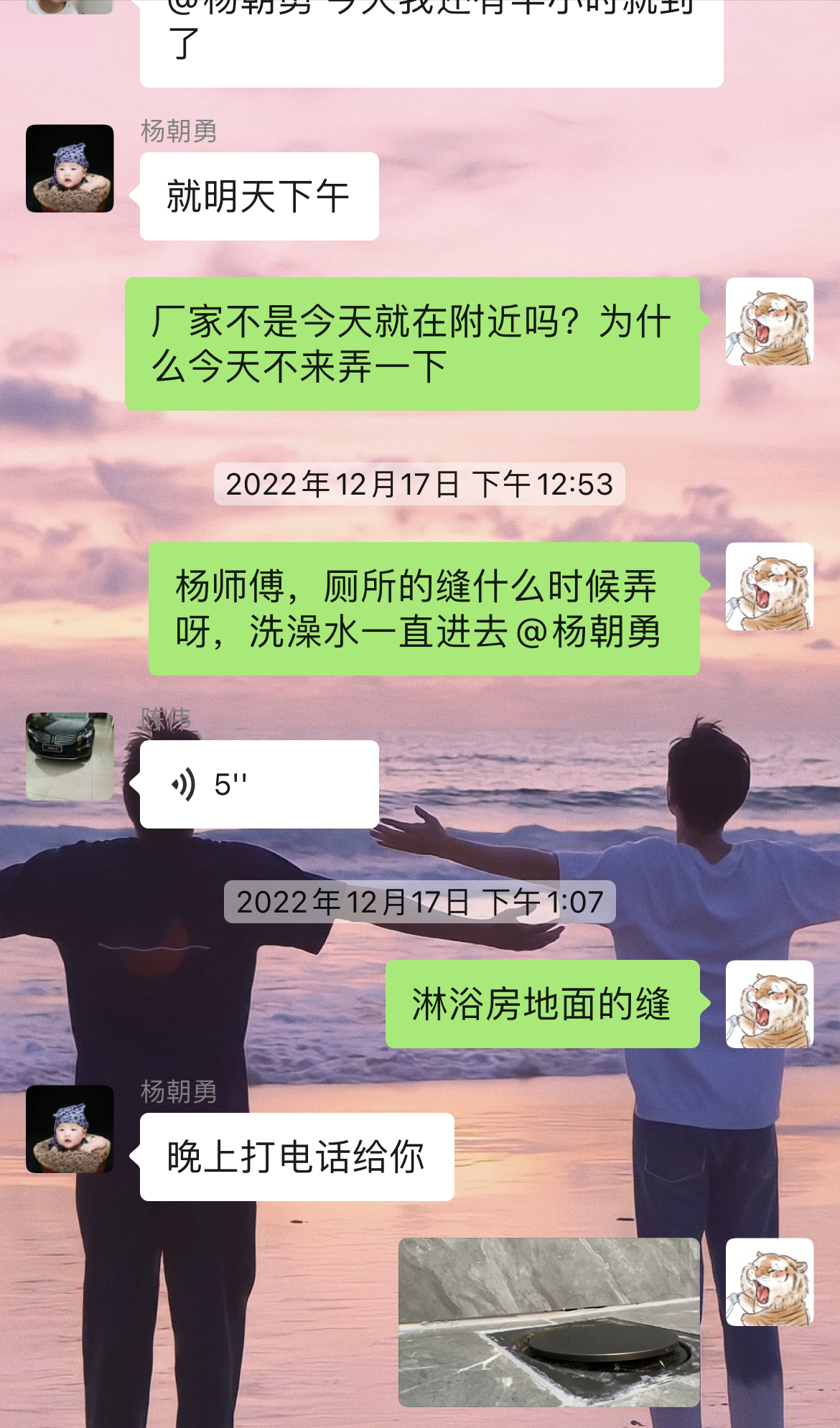 4.淋浴房地面縫隙,洗澡會進水,提醒裝修公司修補,或提供材料我自行修補,答應(yīng)后無消息。