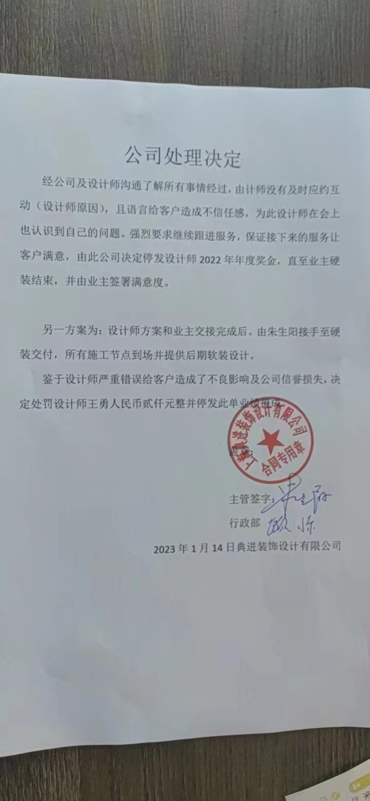 2023 年 1 月 5 日與上海典進裝飾設(shè)計有限公司簽訂裝修合同并有土巴兔平臺監(jiān)管,合同簽訂后典進公司未在約定時限內(nèi)提交確認設(shè)計方案(平面圖、水電定位圖等)。
