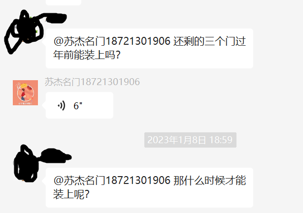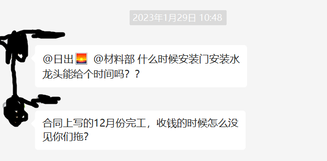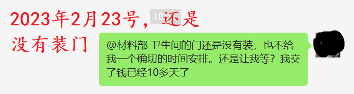 現(xiàn)在一問公司,就是不知道還要多久能搞好。反正就是沒有一個(gè)明確的時(shí)間,還是在拖。2月12號(hào)找我要了一筆1034的衛(wèi)生間門的超越算款,我一給完錢,立刻就開始拖延了,已經(jīng)10天過去了,衛(wèi)生間門還是沒有裝。
