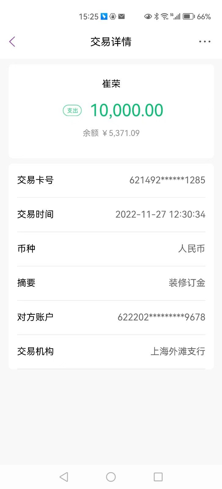 通過網(wǎng)絡(luò)聯(lián)系到被告上海榮尚裝飾設(shè)計有限公司,并就上海市閔行區(qū)季樂路555弄馨盛佳苑22號1401室房屋裝修進行洽談,在未施工的情況下被騙裝修訂金,經(jīng)過當(dāng)面交流后扔不給退。期間上海榮尚裝飾設(shè)計有限公司安排其設(shè)計師潘先輝負(fù)責(zé)與原告洽談裝修設(shè)計,以低于市場價30%的預(yù)算,引導(dǎo)原告支付裝修施工訂金。2022年11月27,在未簽署任何書面合同的情況下,向公司法人崔榮私人賬號轉(zhuǎn)賬支付裝修訂金10000元,并備注“裝修訂金”。