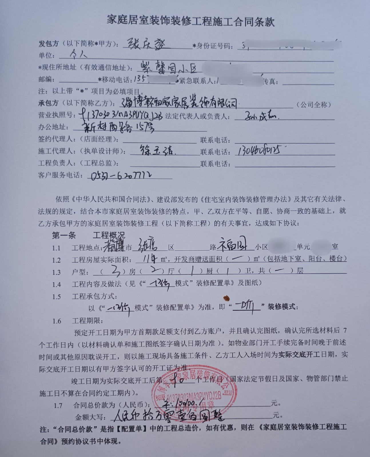 我2022年7月7號(hào)和淄博幸福家家居裝飾有限公司簽訂裝修合同,除了改水電他們不管剩下的所有項(xiàng)目一共10萬元,開工前交了70%7萬元首期款,2022年8月7號(hào)開工,可是直至今日活干了沒有一半,已經(jīng)超過90個(gè)工作日的合同工期,現(xiàn)在已經(jīng)干了7個(gè)多月,天暖和的時(shí)候不施工,2022年11月天寒地凍了開始鋪瓷磚和處理墻面,天冷保障不了施工質(zhì)量,對(duì)業(yè)主的利益及其不負(fù)責(zé)任,目前首期的活還沒干完,櫥柜還沒出設(shè)計(jì)圖,墻面乳膠漆還沒處理完,影視墻巖板還沒貼,但是已有三次讓我交中期款了,第一次是2022年.11月中旬,工頭找我說中期款早晚都要交提前交費(fèi)把鋪地師傅的工錢從我這錢里面給他付了6千多塊剩下的交給公司財(cái)務(wù),第二次2022年12月初工頭又找我交中期款,說公司來了個(gè)白經(jīng)理他家是開柜子廠的,我們公司搞活動(dòng)找100家提前交費(fèi)的客戶在過年前全部裝修完,領(lǐng)導(dǎo)簽字蓋章保證干完,我想來想去我說我找消協(xié)投訴你們公司都沒起作用,你們的承諾我不能信了,還是做完首期的活按合同規(guī)定付款吧,第三次是23年2月中旬,工頭說我家的墻面乳膠漆干完了讓我交中期款,我到裝修現(xiàn)場(chǎng)一看影視墻巖板還沒貼,墻面不平,到處開裂,到處劃痕顏色不均,工頭又讓工人修了兩次,目前還是沒修好。