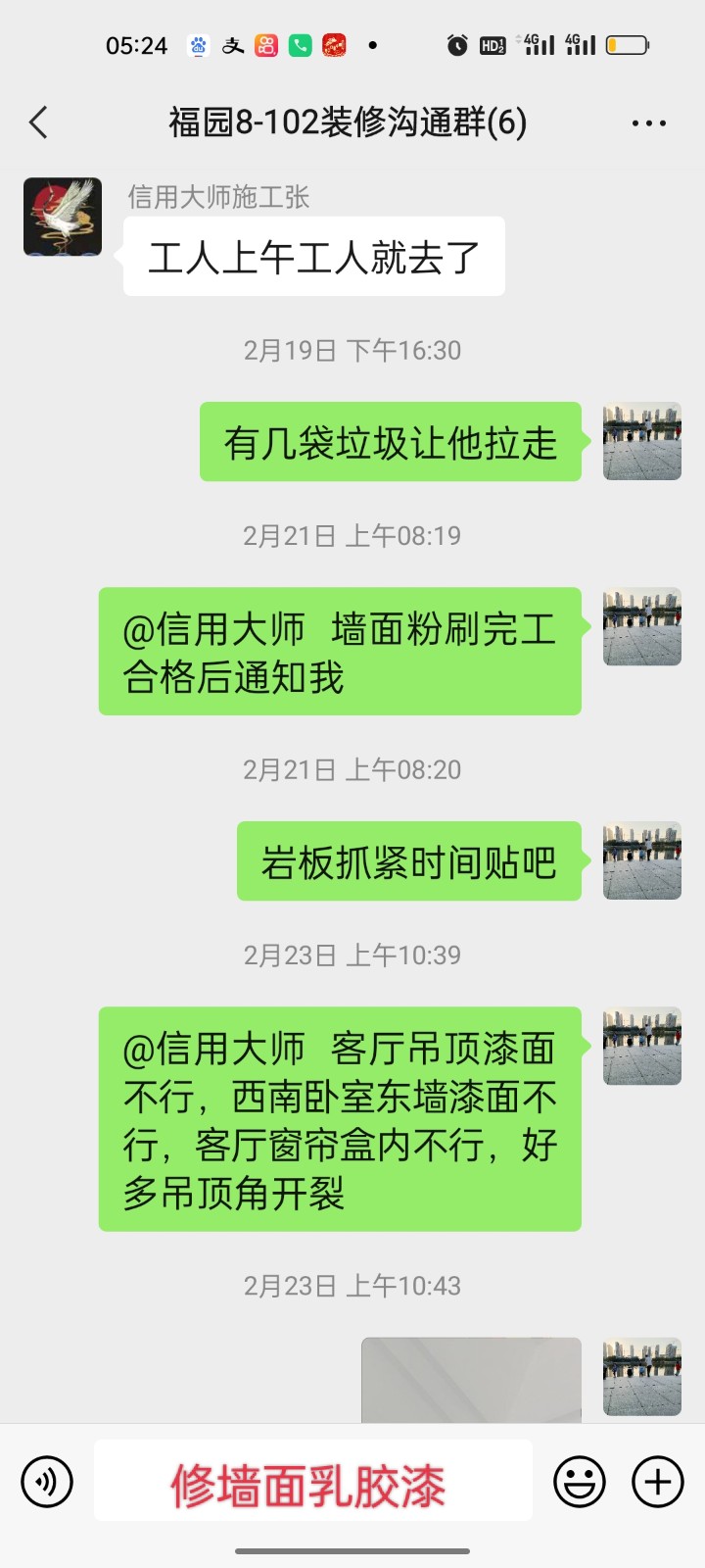 給我家干活的工人都是工頭在外面找的,有沂源的泰安的德州的,都不是他們自己的工人,所用材料都是不知名小廠產(chǎn)品,施工工藝差,施工質(zhì)量差,我也是實(shí)在沒有辦法,簽了合同交了錢就得任由幸福家公司擺布客戶沒有話語權(quán),也找不到什么部門能約束他們,向消協(xié)和市場(chǎng)監(jiān)管局投訴,他們回復(fù)不接受調(diào)解,結(jié)果消協(xié)和市場(chǎng)監(jiān)管部門就沒有辦法了,這是一種霸權(quán)主義,老百姓的權(quán)益無人保障,我要和幸福家裝修公司解除合同,把剩余的裝修款要回來不再受這種痛苦折磨,我是后悔莫及怎么會(huì)遇到這樣不靠譜的裝修公司。