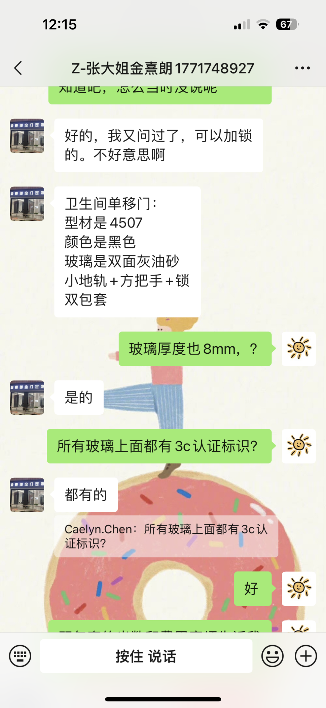 2、 金熹朗門店在2023 年2月7日上門測量,2023年2月8日門店銷售通過微信跟我核對(duì)并確認(rèn)所有玻璃都有國家規(guī)定的3C認(rèn)證標(biāo)志,我支付了15000元(如圖2、圖3)