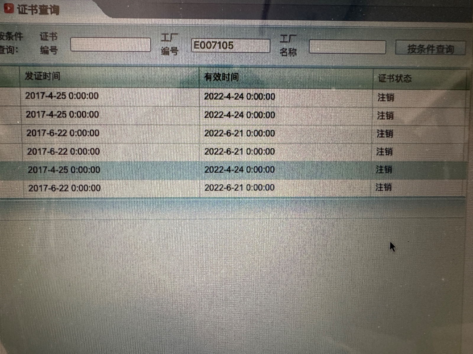 4、 2023年3月15日晚上9點(diǎn),我將金熹朗自產(chǎn)的玻璃門上的3C認(rèn)證標(biāo)志編碼(E007105)通過國家建材檢驗(yàn)認(rèn)證官網(wǎng)查詢3C證書真?zhèn)?,查詢證書在2022年4月已注銷。(如圖5)