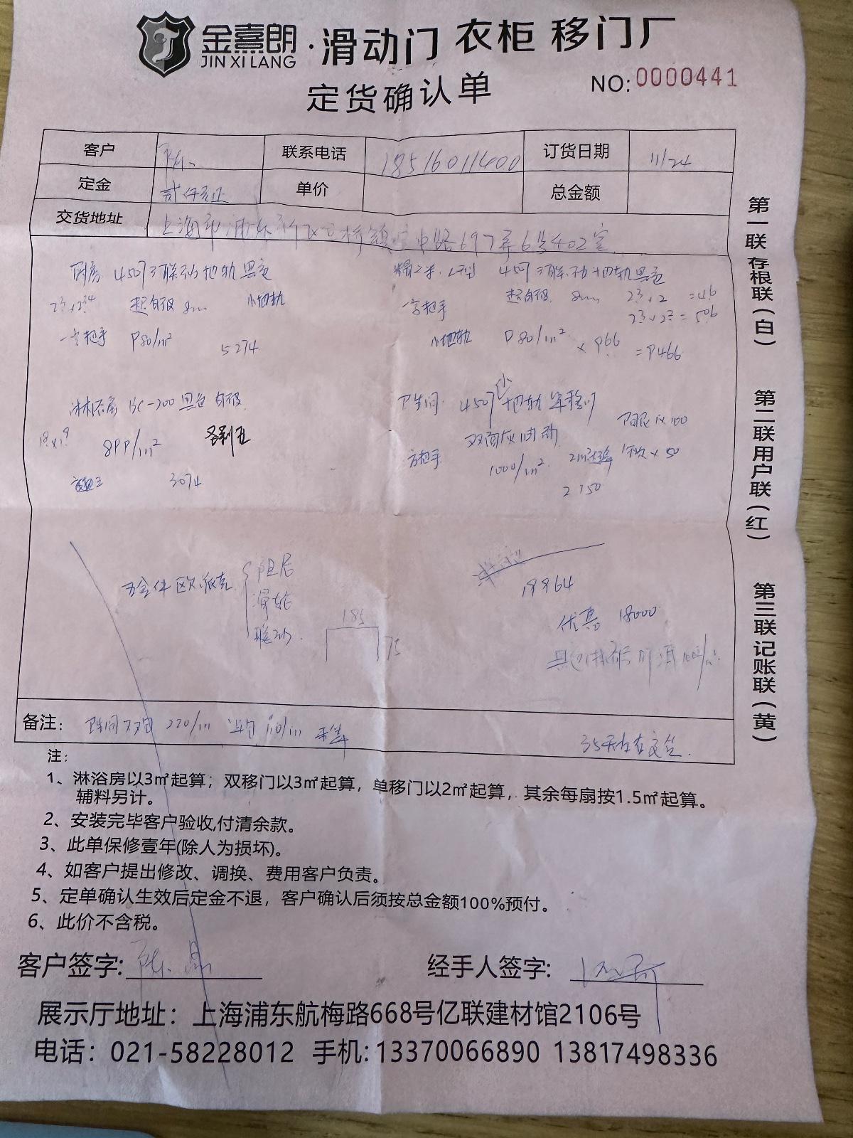 1、 本人在2022年11月24日在浦東新區(qū)億聯(lián)建材市場B管的金熹朗門店(隸屬于上海爵士裝飾材料有限公司)訂購了共5個(gè)玻璃推拉門,定金支付2000元。