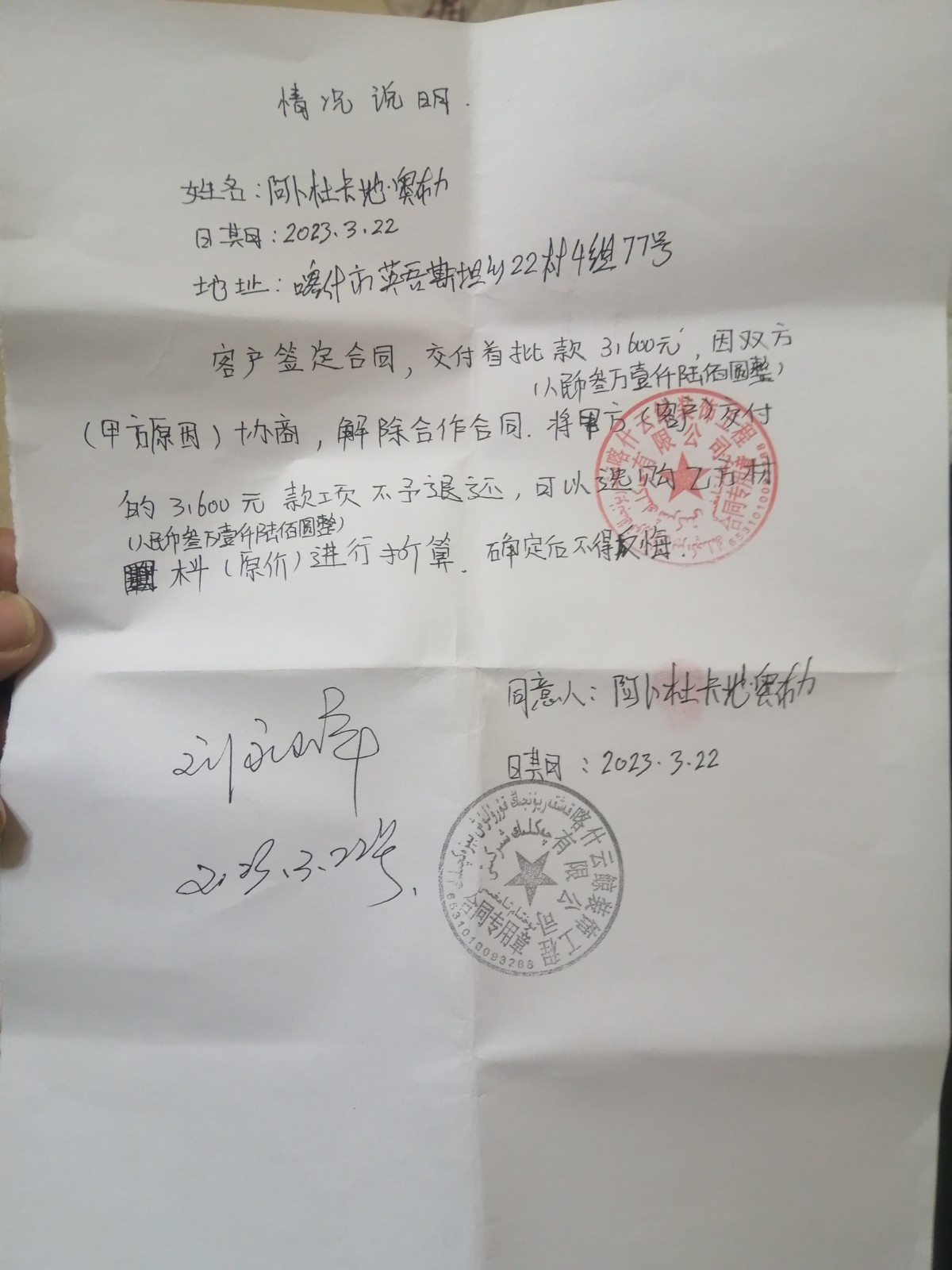 所以最終商量后解除了合同。但是他不給我退我的31,600元首付款。他說這個錢不退,只能買他們公司的材料才行。