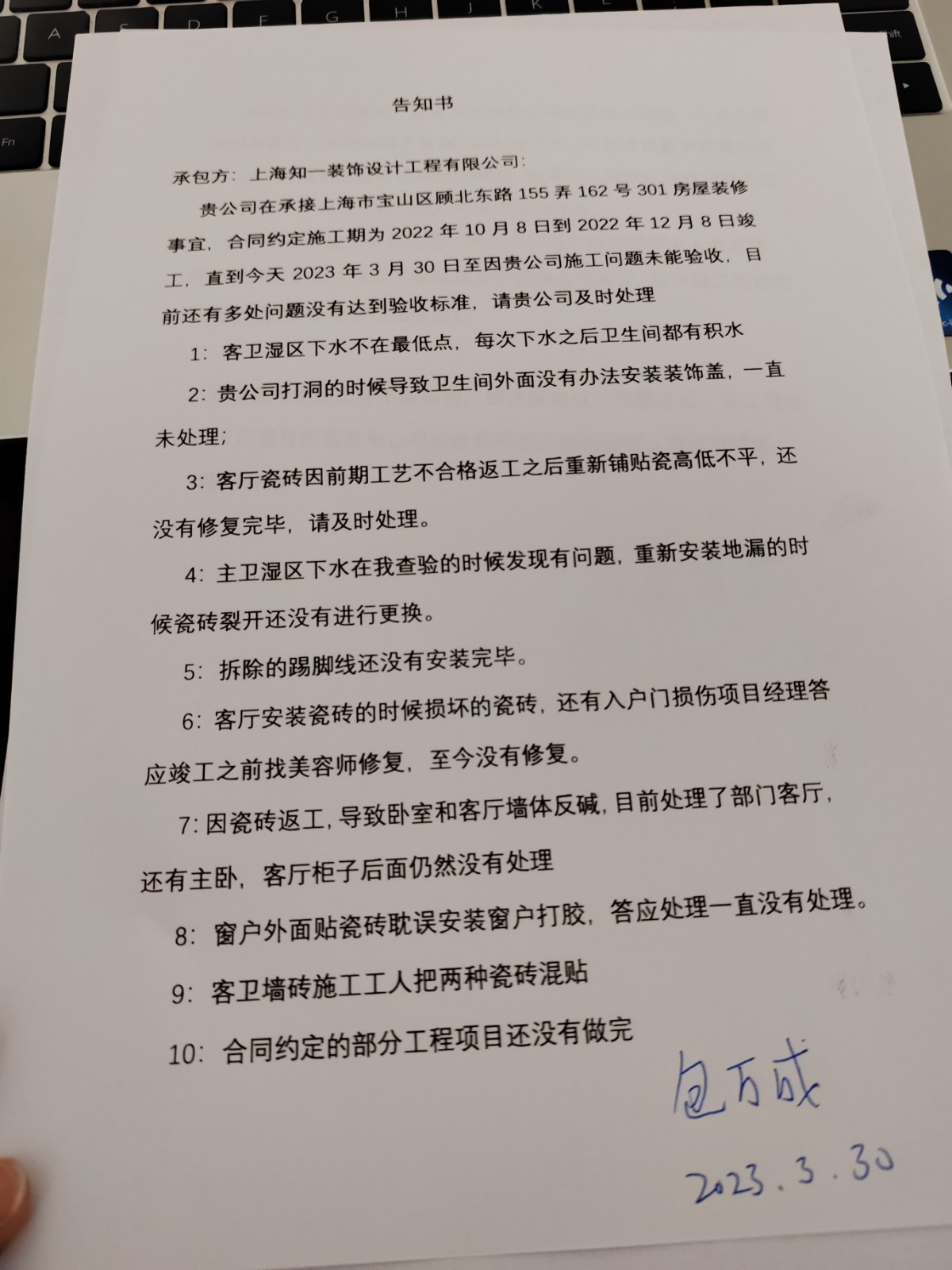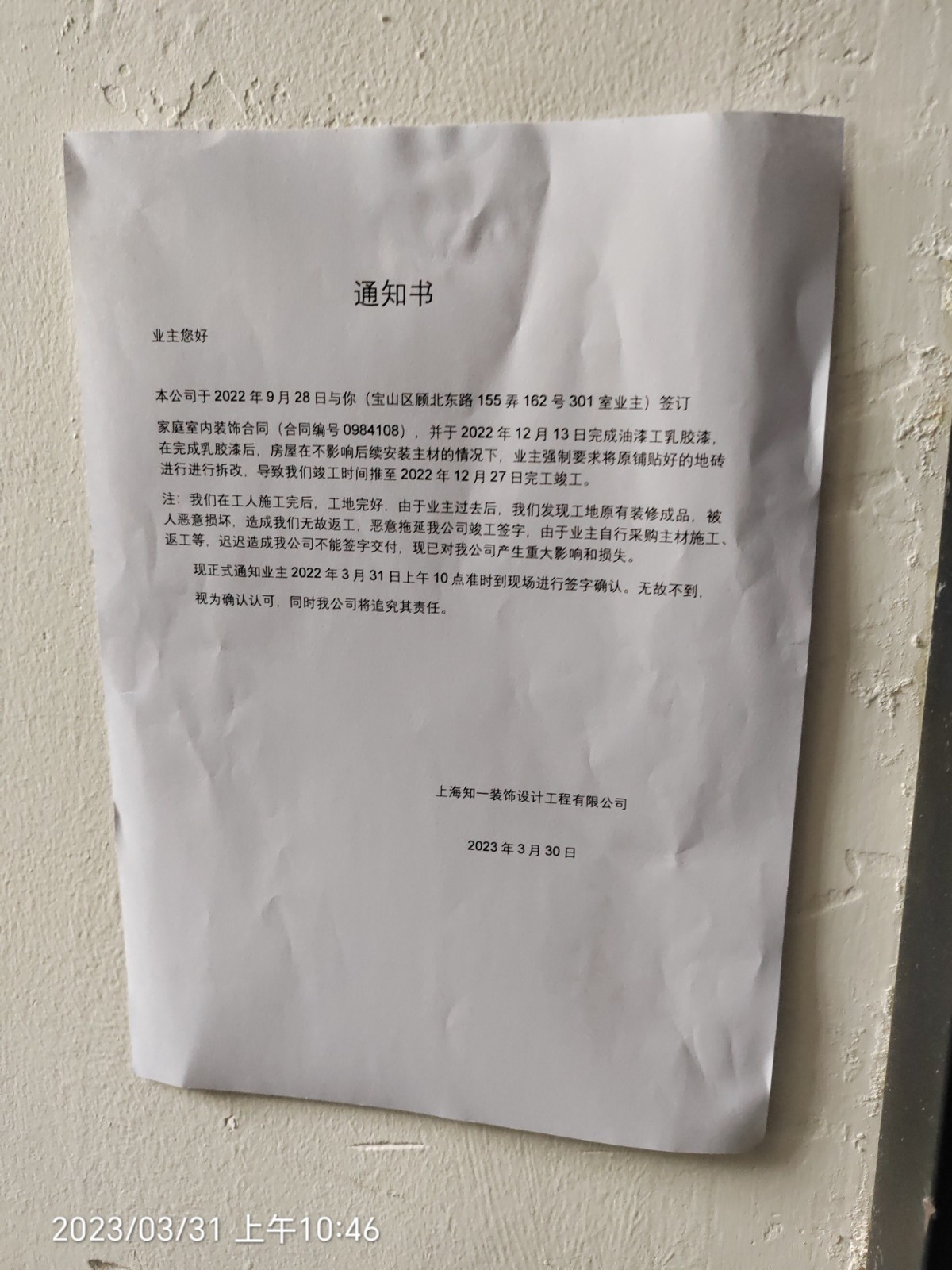 | 投訴類型 | 施工質(zhì)量 | 投訴人 | 包** | 被投訴單位 | 上海知一裝飾設(shè)計(jì)工程有限公司 |