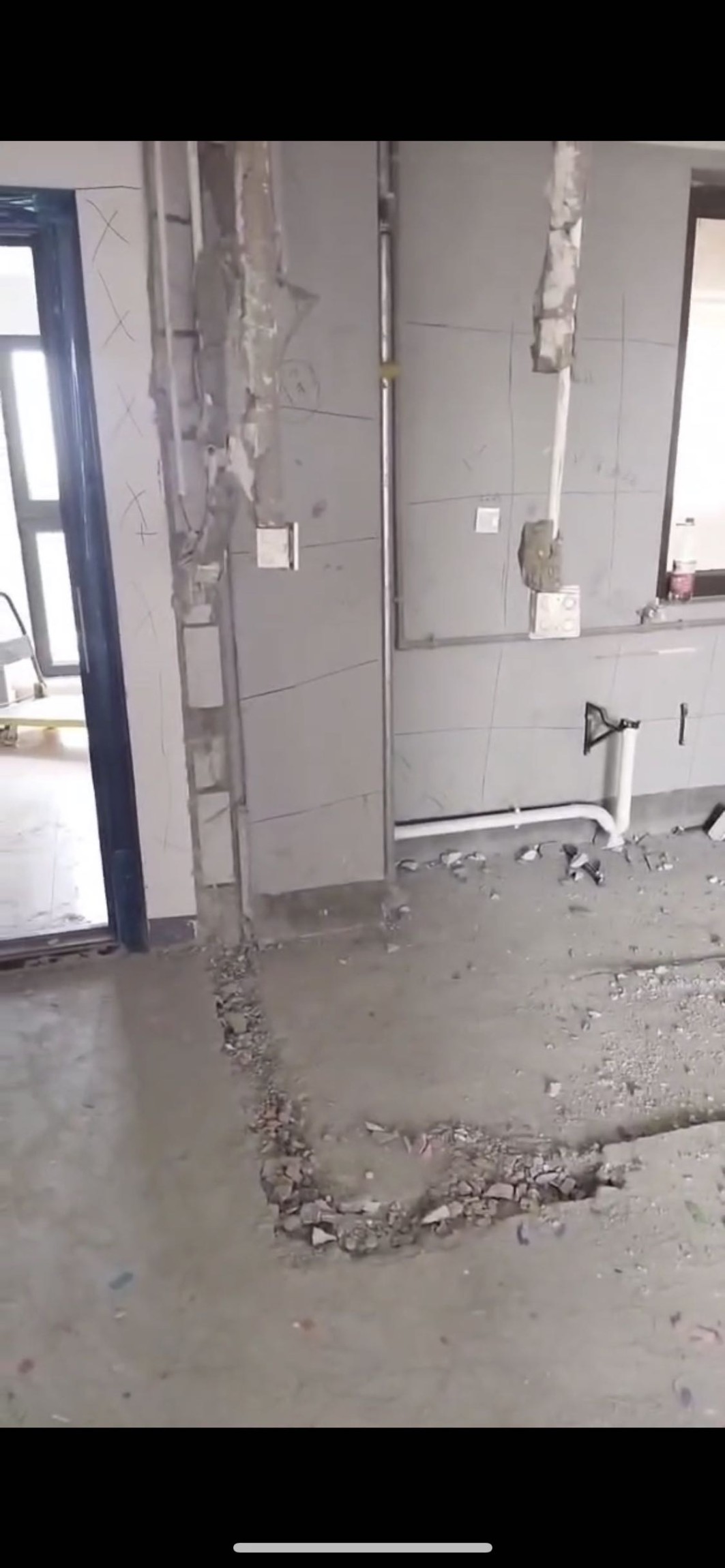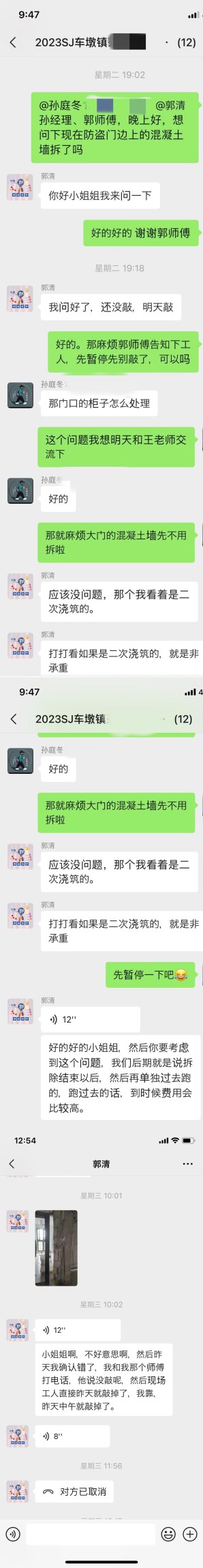 首先,施工隊野蠻施工,拆除了防盜門邊上的鋼筋混凝土墻。前期拆除交底的時候,試著敲了下發(fā)現(xiàn)不是磚墻,項目經(jīng)理沒具體告知情況,只說這個墻質(zhì)量比較好,我們也不知道具體情況。拆除施工時候我家人去現(xiàn)場看了下,覺得可能不太好敲,直到中午我家人走之前這個墻還是沒有敲的(有視頻證據(jù)),回家后全家商量一致決定不敲了,就在群里先確認(rèn)了有沒有敲,負(fù)責(zé)拆除的師傅說沒敲,我們就立馬叫停了。第二天早上去現(xiàn)場看,說已經(jīng)全部敲掉了,而且拆的很暴力。拆除師傅遇到這種情況也沒有及時匯報工頭或者項目經(jīng)理,項目經(jīng)理或者公司也沒有人和我們說這個墻是什么情況。負(fù)責(zé)的拆除郭師傅后來發(fā)微信承認(rèn),他們確認(rèn)錯了。后來因?yàn)檫@個墻的問題,我簽了停工單,要求先處理這個問題,解決后再進(jìn)行下一步施工,對方也都認(rèn)可。