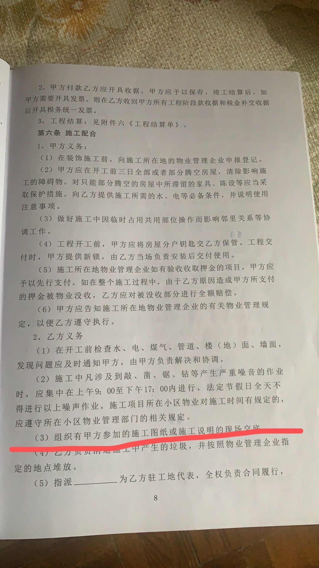 合同約定乙方有義務(wù)組織有甲方參加的現(xiàn)場交底,乙方?jīng)]有盡到應(yīng)盡的義務(wù),加上前期一直溝通不暢,項目經(jīng)理也沒有及時提交項目進(jìn)度表,不主動告知施工安排先斬后奏,提出問題不能好好解決。并且,施工圖紙都沒打印最終版讓我們確認(rèn),只讓微信群溝通,溝通也無果。
