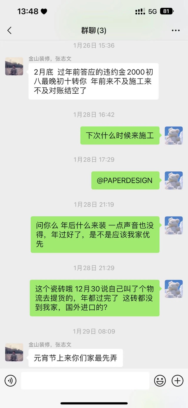 期間多次與裝修公司負(fù)責(zé)人溝通加快施工進(jìn)度,本人與2022年12月18日結(jié)婚,不可耽誤新房。但裝修公司負(fù)責(zé)人屢次爽約,不顧我的需求,施工1天休息30天,房子空著無(wú)人施工,今2023年5月扔未完成施工。