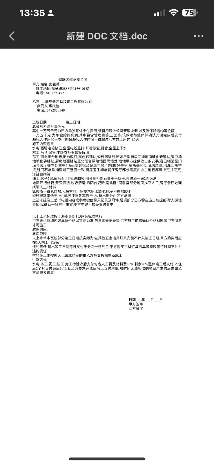 | 投訴類型 | 合同糾紛 | 投訴人 | 史** | 被投訴單位 | 上海華盛藝墅裝飾工程有限公司 |