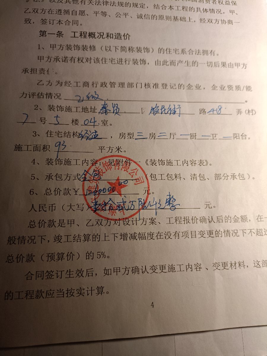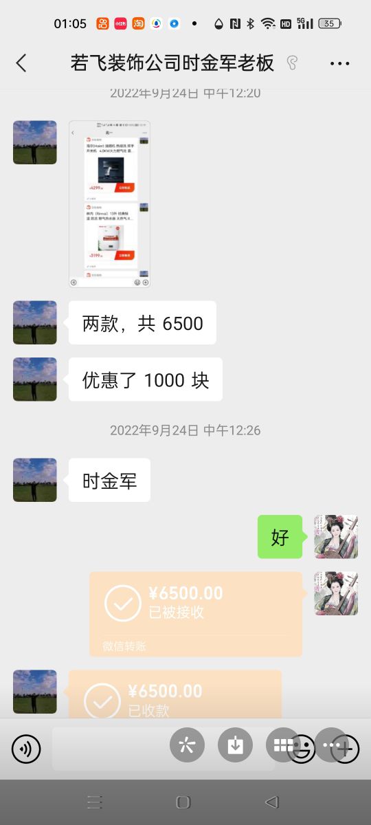 我方奉賢區(qū)農(nóng)民街418弄7號經(jīng)別人介紹(不詳)于若飛裝飾公司2022年6月19號簽訂裝修事宜,合同內(nèi)容承包方式全包(包工包料,清包,部分承包。具體承包哪些內(nèi)容裝修方并未告知。當(dāng)初說好的是全屋整裝。有半包預(yù)算書。合同應(yīng)為2022年9月30號竣工,工期100天。在9月初因格局問題(衛(wèi)生間)我方提出返修,口頭協(xié)商為期一個(gè)月。應(yīng)在11月30好竣工。但至今仍然拖延。在2022年11月中旬裝修老板告知我(當(dāng)時(shí)就告知我說燈具是不包含在內(nèi)的,我有燈具發(fā)票)去和裝修老板合作供應(yīng)商處(奉賢區(qū)南奉公路6105號)挑選馬桶,花灑及洗手臺和大小2個(gè)臺盆和水龍頭。期間并未告知我家預(yù)算清單里不包含(馬桶,花灑洗手臺和臺盆水龍頭)。就這些內(nèi)容我已多次提醒時(shí)金軍接近尾聲了要送貨安裝,但他每次都以各種借口推脫。本月22號突然告知我說我家預(yù)算清單里不包含馬桶花灑,洗手臺臺盆和水龍頭這些。我要他出示清單內(nèi)容至今沒有給我看。各種耍無賴。無底線。9月份我和先生已去公司挑選好地板及櫥柜門顏色和款式。在挑選過程中裝修老板時(shí)金軍趁機(jī)就忽悠說熱水器抽油煙機(jī)和灶臺,說是在公司下單可以便宜點(diǎn)錢。我們就相信他了。于9月份轉(zhuǎn)款6500元要時(shí)金軍代購熱水器抽油煙機(jī)灶具(有微信轉(zhuǎn)賬記錄)。但至今已各種借口推脫,甚至提出要我們自己出錢去買熱水器抽油煙機(jī)灶具。我向時(shí)金軍交涉要他把代購6500元返還給我,他也不同意。