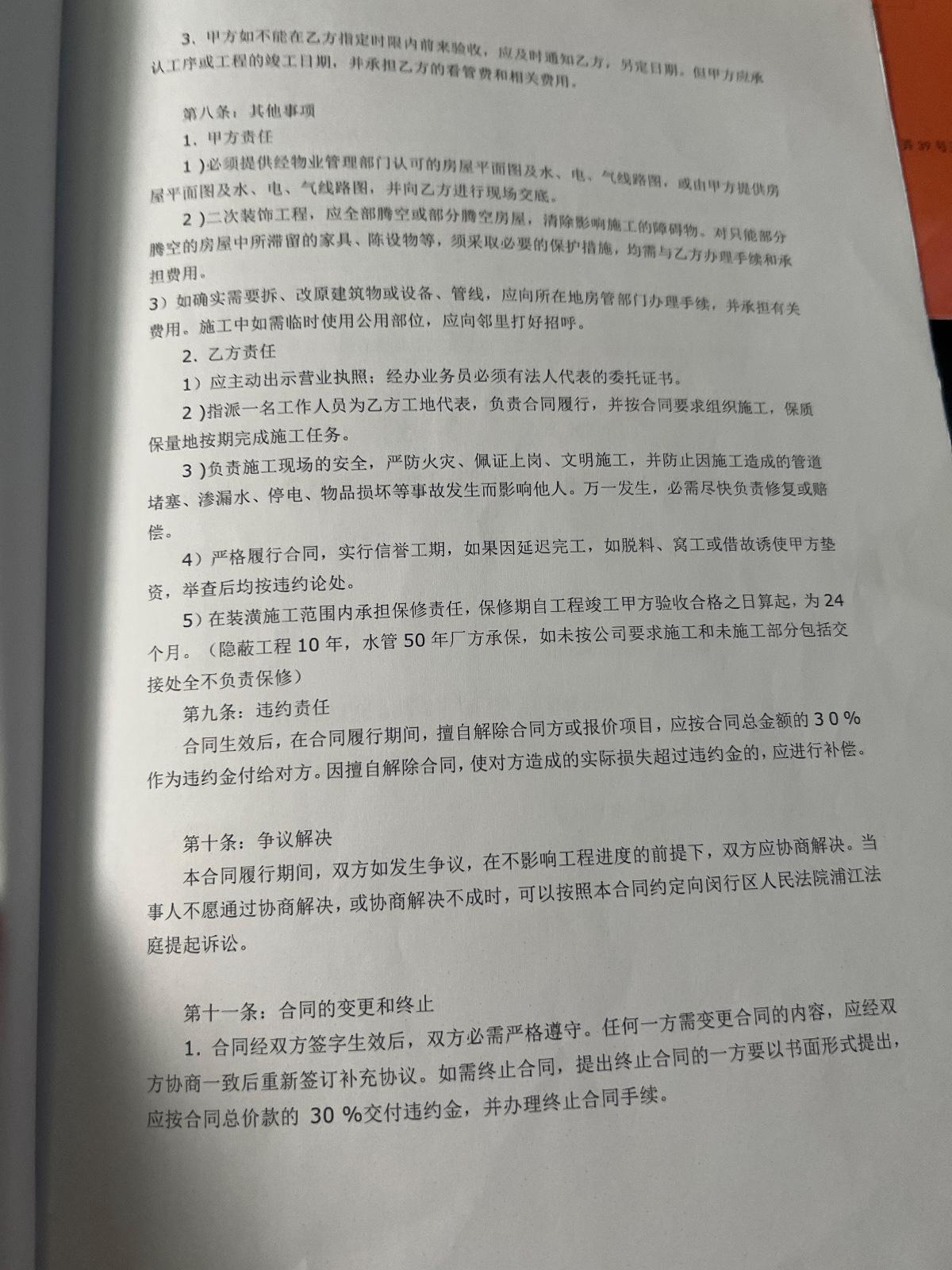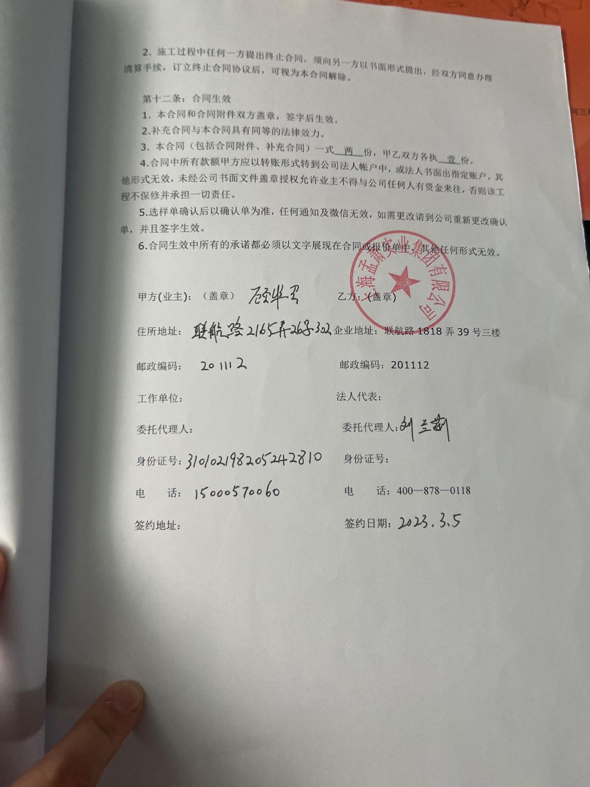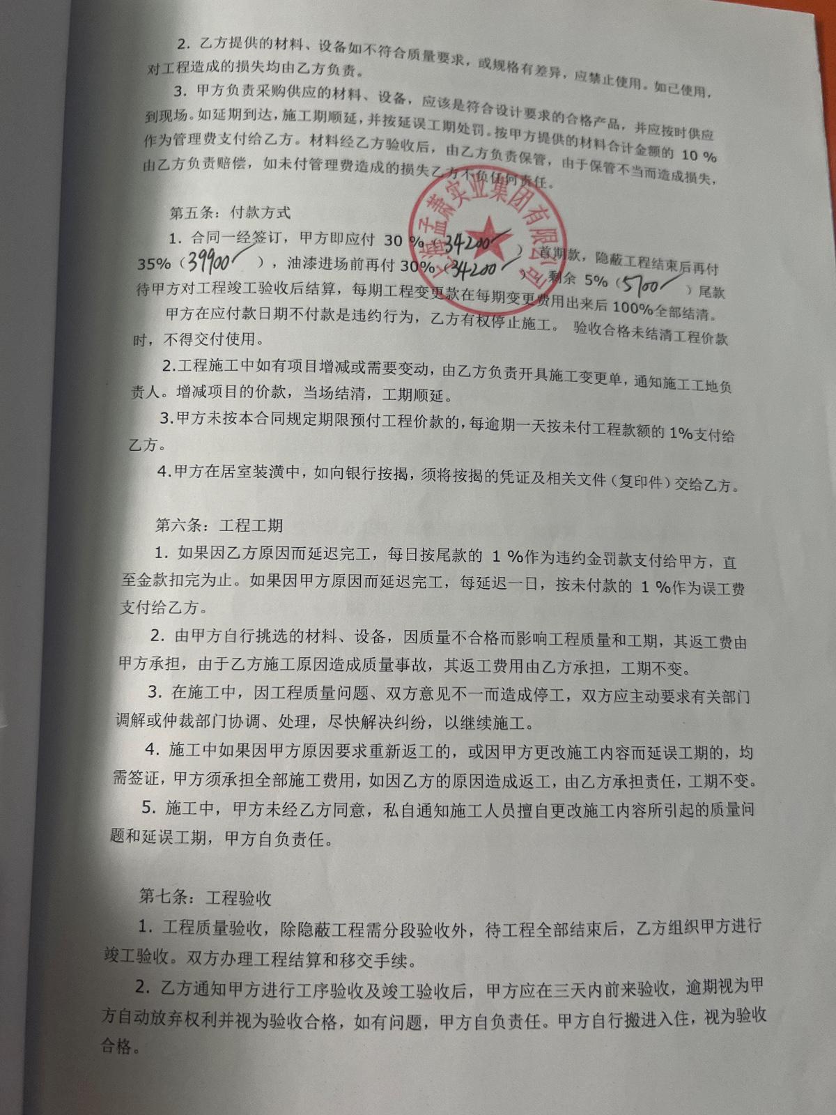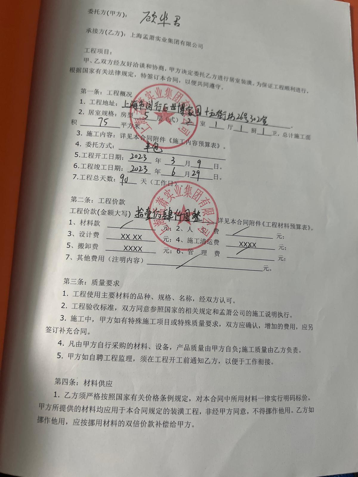 1:孟蕭實業(yè)集團(tuán)有限公司給我們我們簽訂合同之前說的是裝修差不多12萬左右,簽訂合同是以半包方式簽訂,但是工程款項把全屋定制櫥柜方面的3萬余元算在一起了(本著信任的原則,依照合同3期款項都已付清)