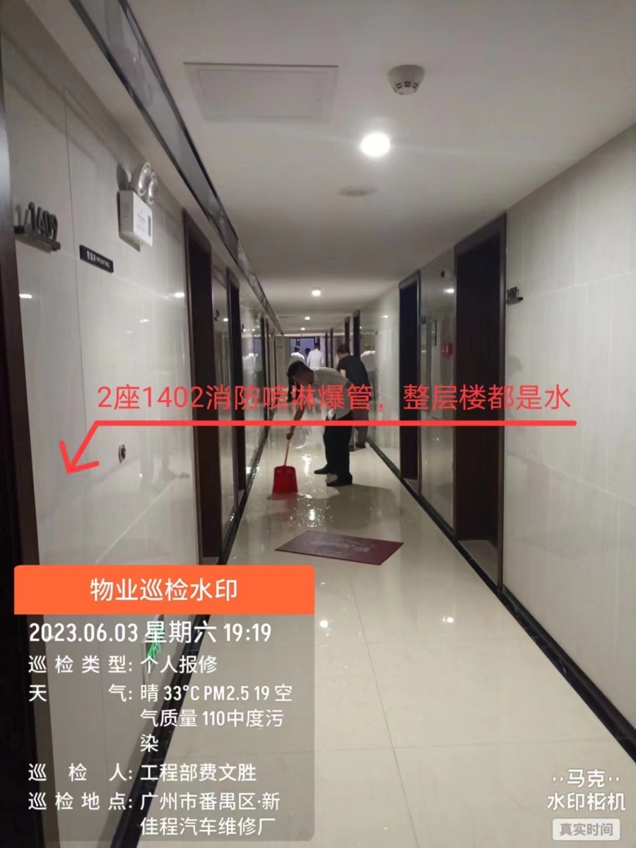 驗(yàn)收當(dāng)天發(fā)現(xiàn)有部分燈位和消防噴頭周圍墻面沒有充分刷漆,咨詢對(duì)接的立邦專員是否可以補(bǔ)漆,專員在當(dāng)天下午帶上了膩?zhàn)臃酆推渌ぞ哌M(jìn)行施工,施工時(shí)因?yàn)橘F司員工不專業(yè)和沒有常識(shí)的行為導(dǎo)致主臥房間內(nèi)消防噴淋頭被觸發(fā)噴水,瞬間將整個(gè)屋子甚至整個(gè)樓層以及電梯和樓道受淹。事發(fā)的時(shí)候貴司員工除了喊我先生查看,并沒有及時(shí)處理和上報(bào),我及時(shí)聯(lián)系了物業(yè)協(xié)助和關(guān)閉消防水源,最終在當(dāng)天晚上凌晨?jī)牲c(diǎn)多才稍微把表面的積水清理掉,我一晚上通宵都在處理殘局。在我們多次督促下,貴司專員第二天早上才電話聯(lián)系公司“領(lǐng)導(dǎo)”,領(lǐng)導(dǎo)也不重視和及時(shí)關(guān)注,說要下午才能過來,早上還有別的事情,直到在客服群里投訴,另一位所謂的“何經(jīng)理”才上門來查看情況。