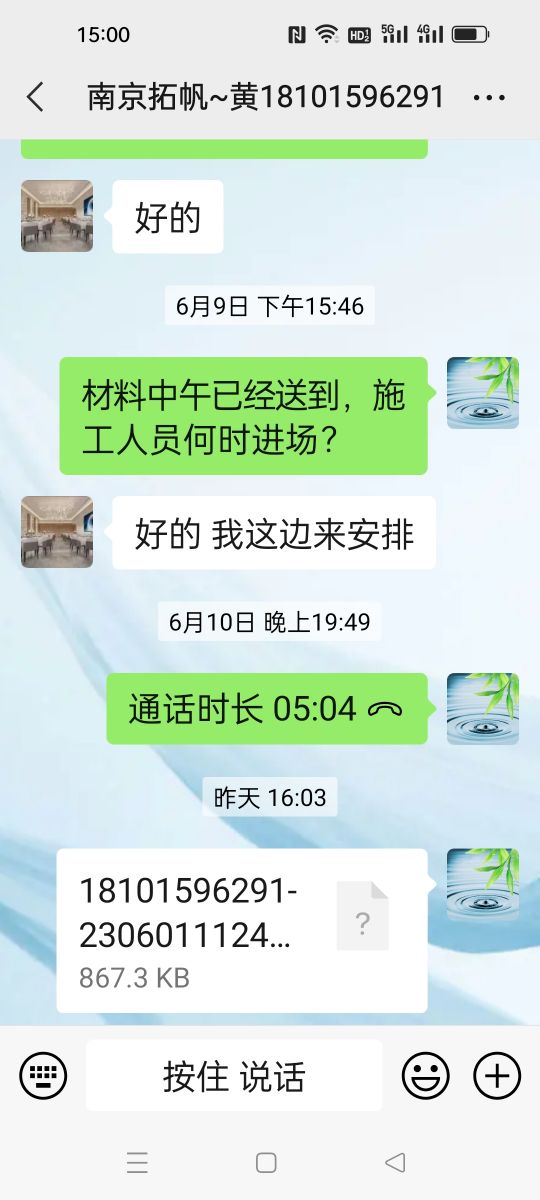 他們終于把墻板寄過來了,快遞費(fèi)依然我支付。我讓他們趕緊安排施工人員干活,結(jié)果又告訴我說只安排現(xiàn)場指導(dǎo),之前和我聯(lián)系施工經(jīng)理因為和他們出現(xiàn)了矛盾,被他們開除了,也可能是良心發(fā)現(xiàn),不想再欺騙人了。又新安排一個施工聯(lián)系經(jīng)理黃18101596291,說以前的經(jīng)理說什么我不知道,我剛接手,現(xiàn)在讓我自己找木工,就這樣一步步誘騙。