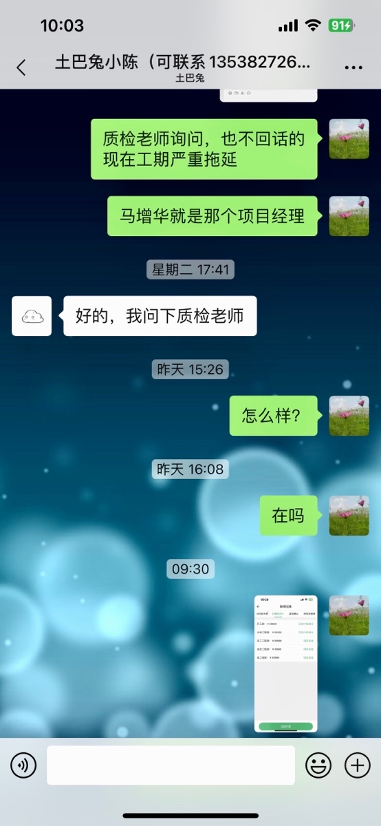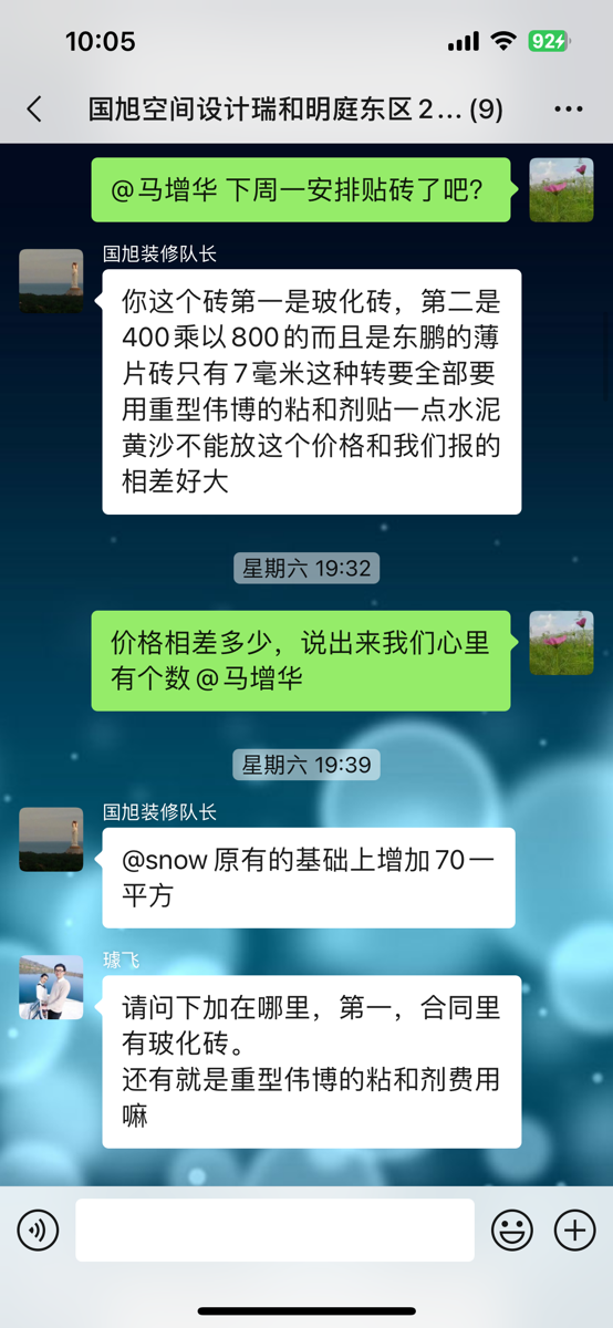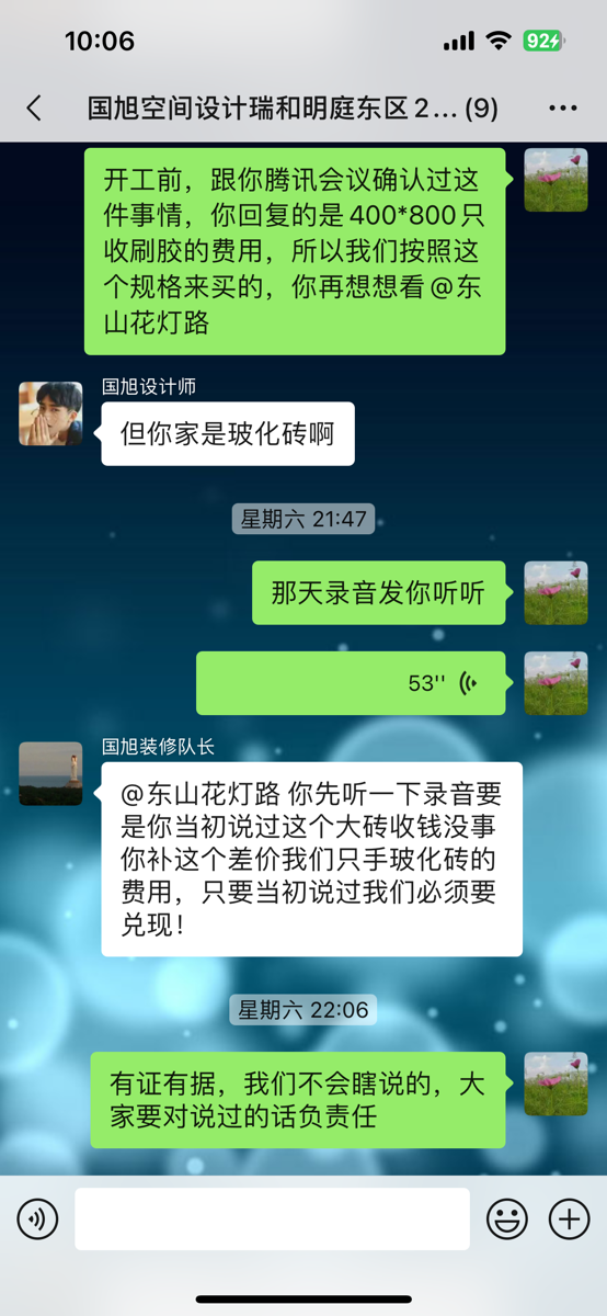 無故增加合同附件額外價(jià)格,瓷磚要求額外增加70元一平,合同清楚寫著30*60瓷磚按合同收費(fèi),小于20cm增加人工30元一平,并且有設(shè)計(jì)師錄音,我購(gòu)買的是40*80瓷磚,根據(jù)合同報(bào)價(jià)不需要額外加錢,雙方溝通無果,無奈找到第三方土巴兔,但結(jié)局一樣沒人回應(yīng)、協(xié)商。