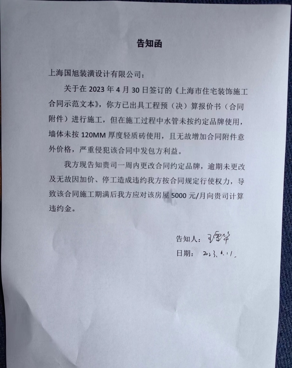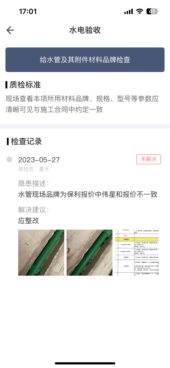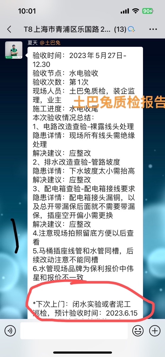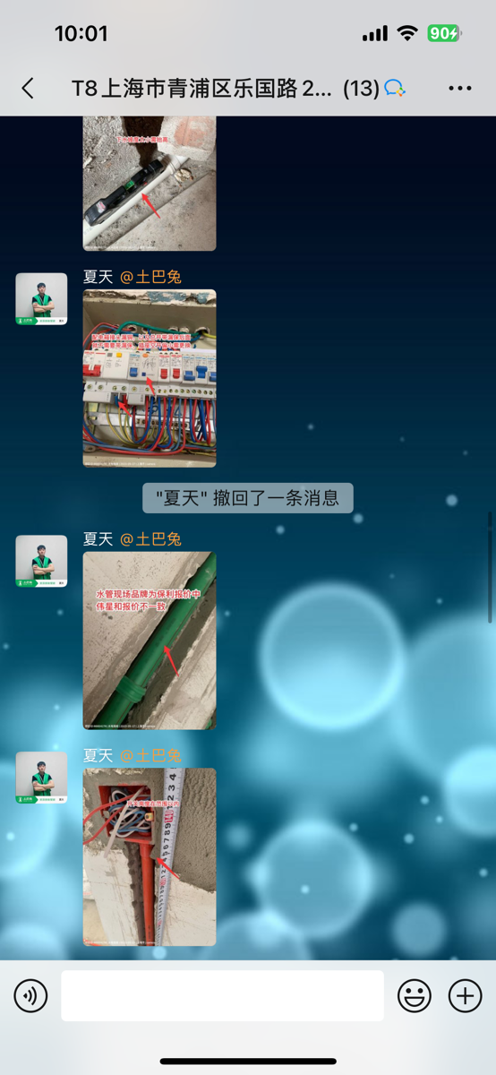但施工中未按合同約定的水管品牌使用并隱瞞,后水電完工土巴兔質(zhì)檢老師檢查出水管和一些質(zhì)檢問題,包括墻體未按120mm厚度輕質(zhì)磚使用,以上土巴兔已將驗(yàn)收未通過事項(xiàng)告知裝修方,要求整改,至今未回應(yīng)。