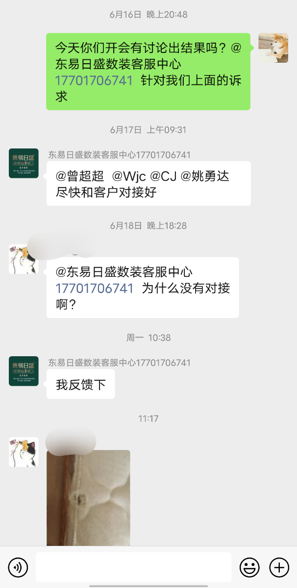 針對(duì)以上問題,業(yè)主多次上門溝通或微信溝通,投訴至東易日盛客服,然而公司各個(gè)部門相互推諉,敷衍了事,再三拖延。