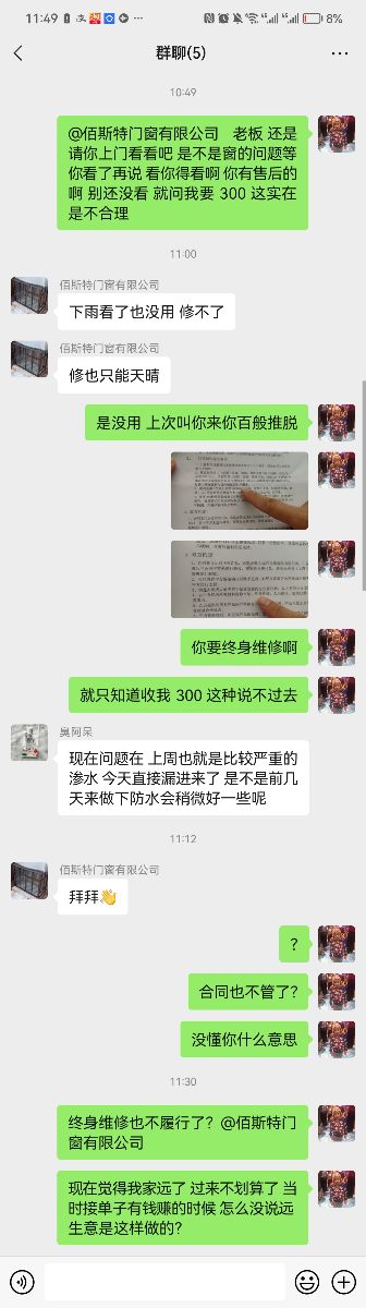 門窗與墻體接縫處多次滲水漏水,致電老板,老板現(xiàn)因我家遠且已過兩年質(zhì)保而拒絕上門維修,但合同內(nèi)明確標注“終身維修”。