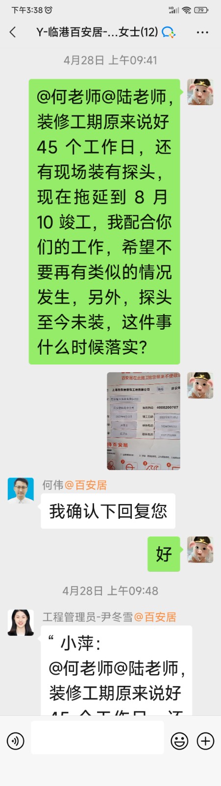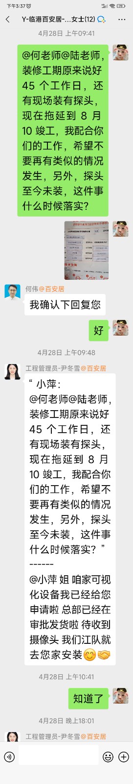 因?yàn)槭枪吕?,想找個(gè)靠譜的正規(guī)的公司做,我是通過網(wǎng)上聯(lián)系百安居的,接觸后,工作人員介紹,裝修好后,有問題還能負(fù)責(zé)的,另外,現(xiàn)場還可提供可視探頭,鑒于這些,我是2023年3月23日和百安居臨港公司簽的合同,4月12日開工的。