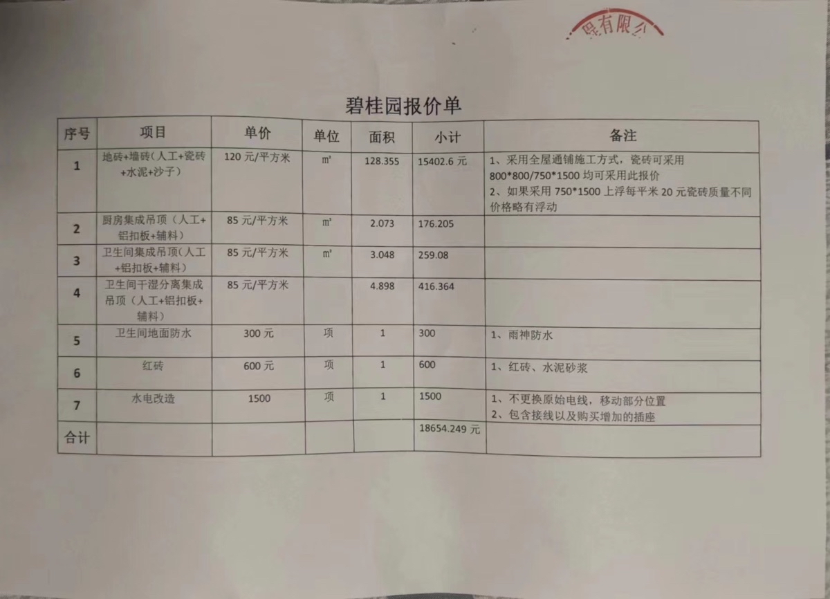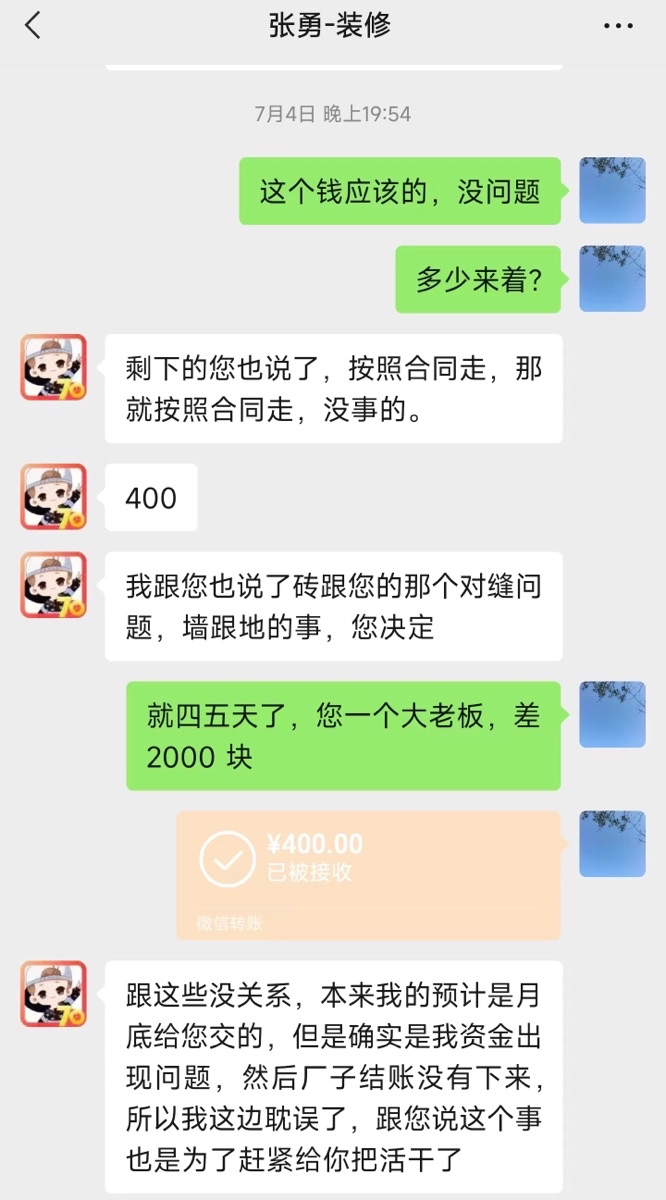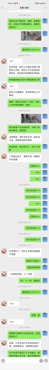 3.業(yè)主與昨日聯(lián)系裝修公司代表張先生到房屋內進行協(xié)商處理,雙方各自提出如下解決方案:裝修方代表張先生認為自己沒有過錯,對于已貼磚部分面積要求全部費用由業(yè)主自行承擔,同時以有事為由,沒有給業(yè)主任何退款承諾,之后便走人,之后便拒不接電話。