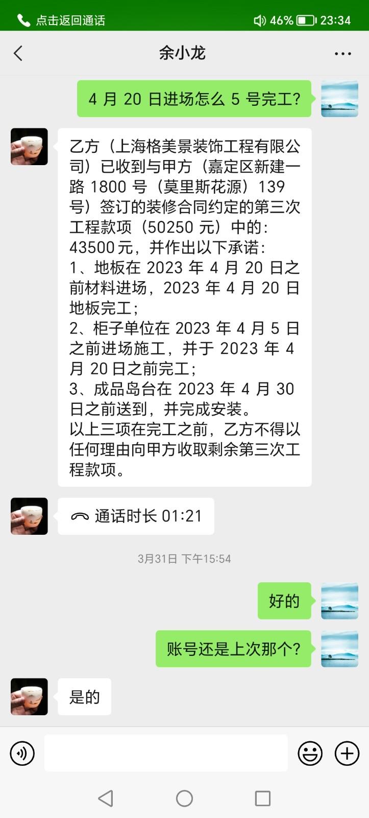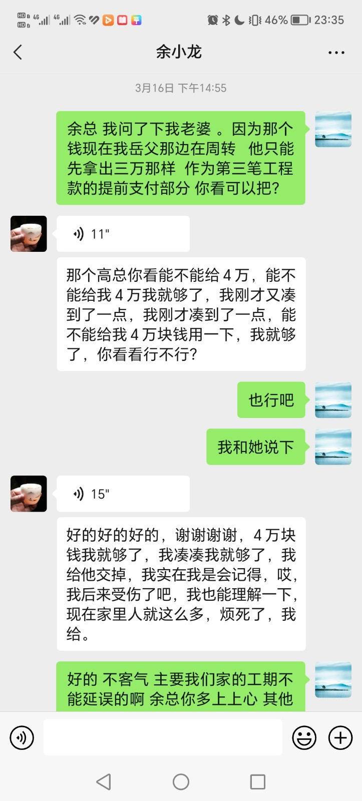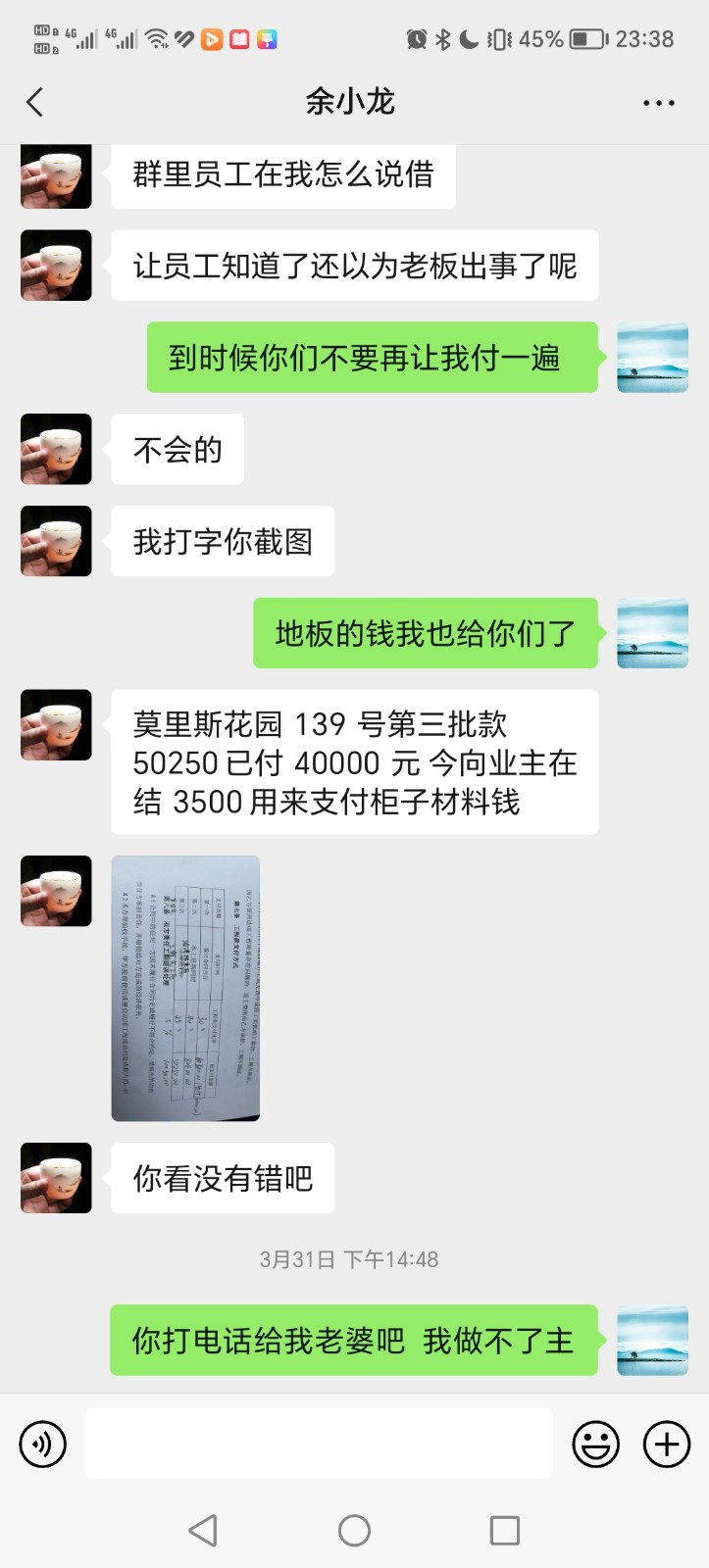 裝修合同總金額20.1萬,按四筆支付,第1筆-合同簽訂當日支付30%(60300元),第2筆-木工進場同時支付40%(80400元),第3筆-油漆結(jié)束后支付25%(50250元),第4筆-工程完工后支付5%(10050元)。其中:第1、2筆已經(jīng)全部支付,打入裝修公司對公賬戶,第3筆總額50250元已經(jīng)支付了43500元,支付第3筆款項時實際并沒有達到工程節(jié)點,但裝修公司老板余小龍借口急需周轉(zhuǎn)資金,請求我們借給他,并打入他個人賬戶,我說不能當借款,只能算第3筆裝修款項的提前支付,于是提前支付了43500元給余小龍(分40000元+3500元兩次),并打入他個人賬戶,要求他在微信留言“第3筆總額50250元中的43500元已經(jīng)收到”,并且在微信承諾“柜子、倒臺、地板沒有完工之前不得再以任何理由收取剩余第3筆工程款項”。目前第三筆剩余6750元未支付(余小龍之前微信溝通樓梯扶手5280元作為減項不愿意做,我們同意了,所以實際第3筆只剩下1470元未支付),另外第4筆由于至今工程未完工所以尚未支付。