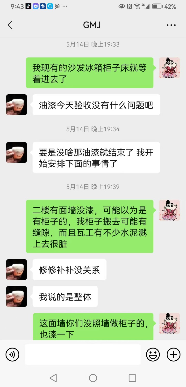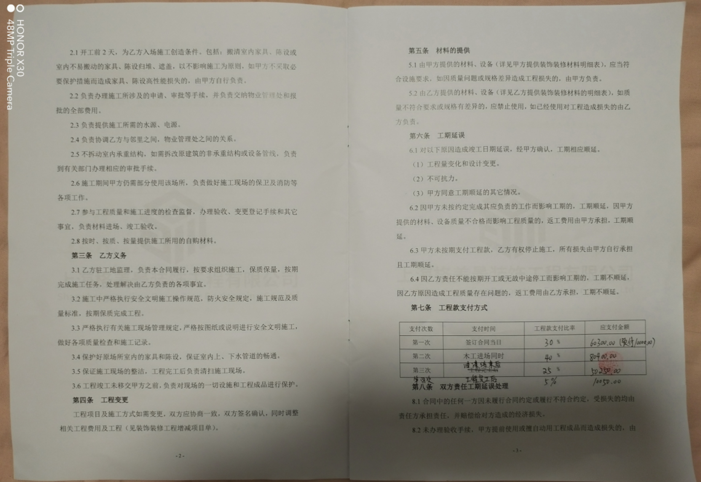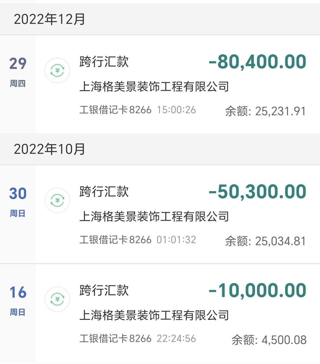 裝修合同總金額20.1萬,按四筆支付,第1筆-合同簽訂當日支付30%(60300元),第2筆-木工進場同時支付40%(80400元),第3筆-油漆結(jié)束后支付25%(50250元),第4筆-工程完工后支付5%(10050元)。其中:第1、2筆已經(jīng)全部支付,打入裝修公司對公賬戶,第3筆總額50250元已經(jīng)支付了43500元,支付第3筆款項時實際并沒有達到工程節(jié)點,但裝修公司老板余小龍借口急需周轉(zhuǎn)資金,請求我們借給他,并打入他個人賬戶,我說不能當借款,只能算第3筆裝修款項的提前支付,于是提前支付了43500元給余小龍(分40000元+3500元兩次),并打入他個人賬戶,要求他在微信留言“第3筆總額50250元中的43500元已經(jīng)收到”,并且在微信承諾“柜子、倒臺、地板沒有完工之前不得再以任何理由收取剩余第3筆工程款項”。目前第三筆剩余6750元未支付(余小龍之前微信溝通樓梯扶手5280元作為減項不愿意做,我們同意了,所以實際第3筆只剩下1470元未支付),另外第4筆由于至今工程未完工所以尚未支付。