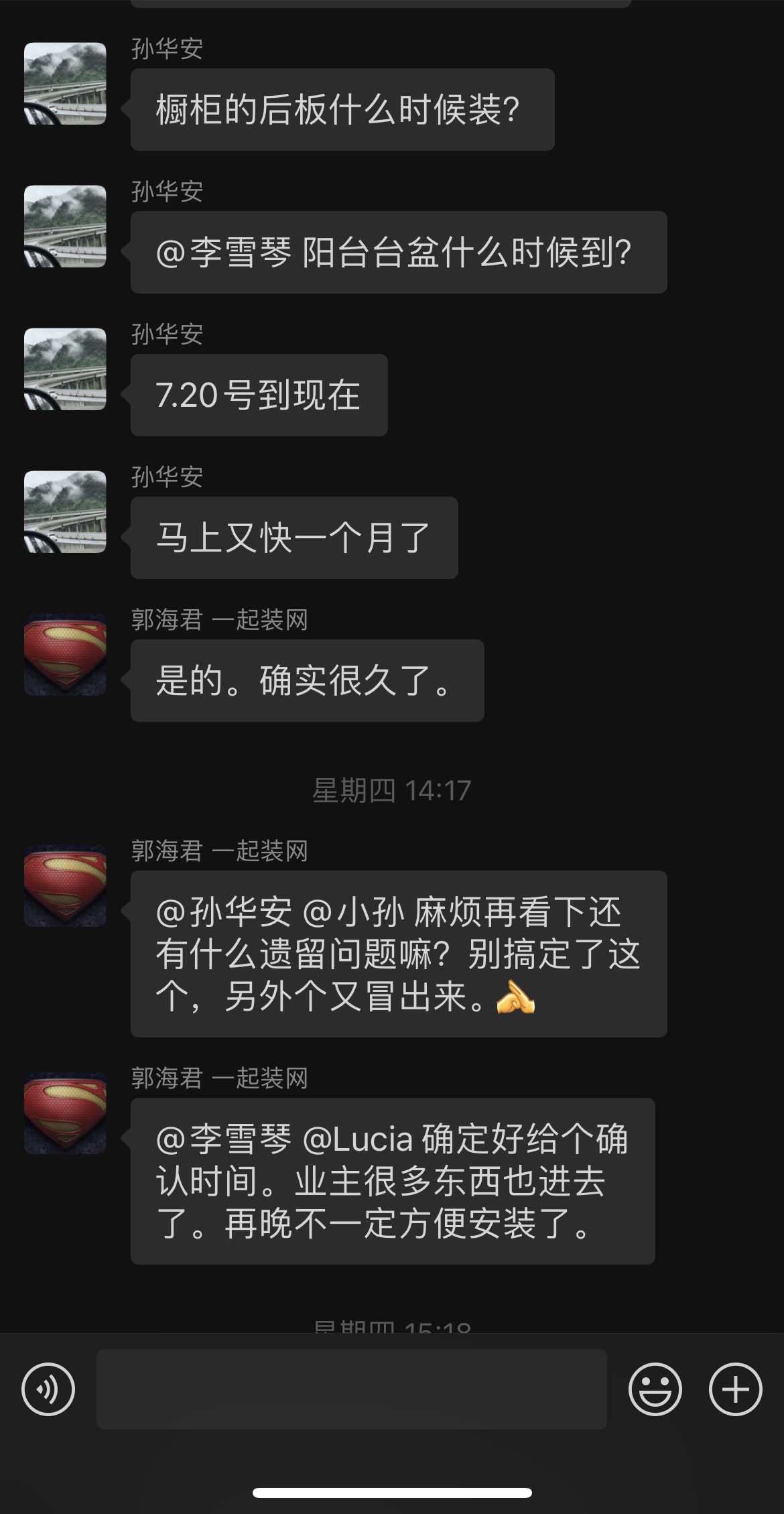 我每次回來(lái)都會(huì)發(fā)現(xiàn)一些常識(shí)施工問(wèn)題,該公司上下領(lǐng)導(dǎo)極度不專(zhuān)業(yè),不負(fù)責(zé),微信群到是有,反饋問(wèn)題,領(lǐng)導(dǎo)們裝聾作啞不理會(huì)。