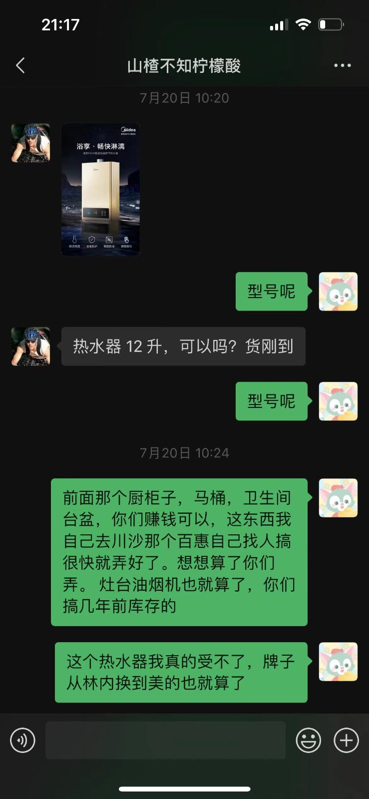 8. 付款2200元讓其購(gòu)買熱水器并且安裝(合同顯示為林內(nèi)熱水器),在沒有和我溝通的情況下通知安裝美的熱水器,不發(fā)送型號(hào)只發(fā)送了圖片,要求發(fā)送型號(hào)沒有結(jié)果,經(jīng)過本人在京東網(wǎng)站搜索,發(fā)現(xiàn)此熱水器和一款售價(jià)700元的熱水器圖片基本一致。與其溝通退款無(wú)果,必須要結(jié)算時(shí)才愿意退款。