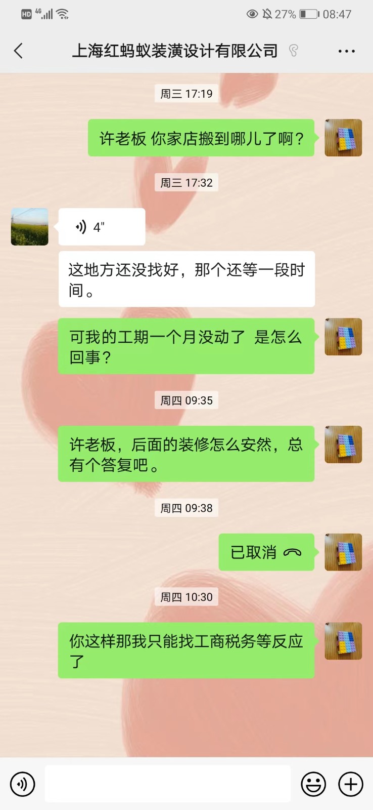 7月中下旬,進(jìn)度慢好離譜,但我們只是微信催促加快進(jìn)度,包工頭也回應(yīng)我了。我們并沒有多想,直到合同約定的8月23日裝修結(jié)束日到了,我們才大吃一驚!整整一個月沒有動工,并且這家紅螞蟻店已經(jīng)消失了。我們才知道,我們被騙了!讓人氣憤的是,一共付了61750元,實際裝修的只有水電+鋪了地磚。 地磚還破了幾塊。。。裝修公司老板許照飛和他員工,還有他的兒子許鴻飛也不知去向。。。。