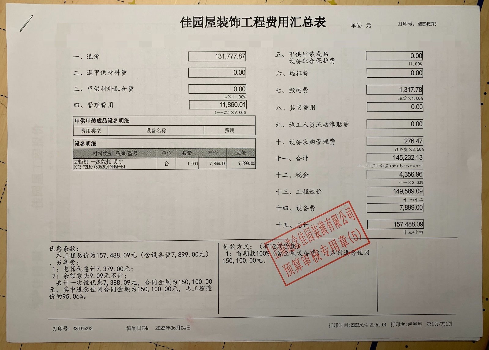 2023年6月,與佳園裝潢曹楊路門店簽訂了合約,預(yù)算金額為150100,首付75%,支付了114549萬,6月10日開工,期間水電不合規(guī),施工進(jìn)度緩慢拖拉整改,供應(yīng)商不進(jìn)場(chǎng),至今雜工剛完成,木工施工一部分。