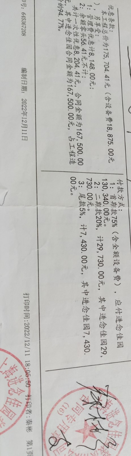 2022年12月11日與佳園裝潢公司靜安門店簽訂裝修全包合同,建筑面積55平方,預算金額為17.57萬元。