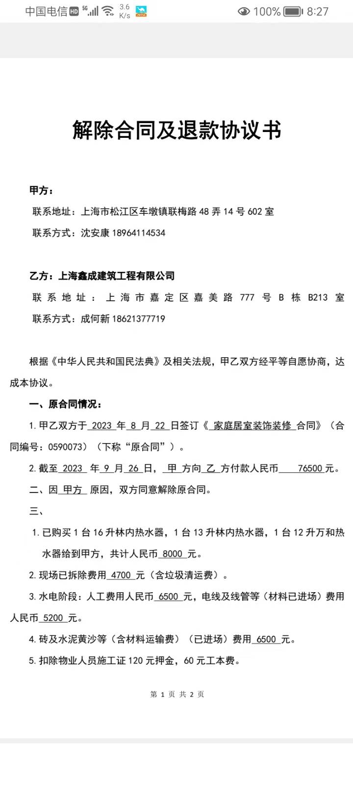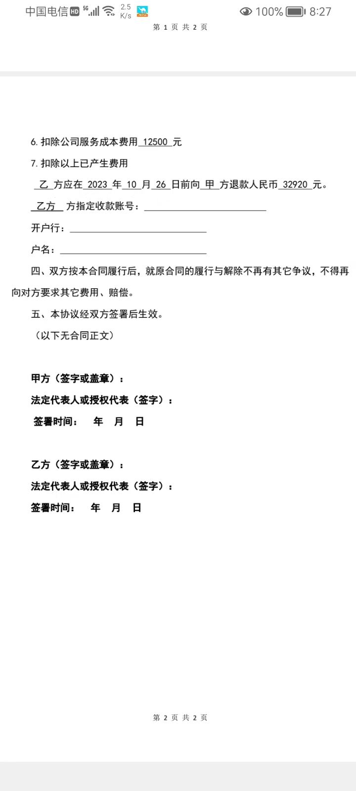 9月26日,馨成發(fā)來退款協(xié)議(附圖8-9),收取費用43580元。