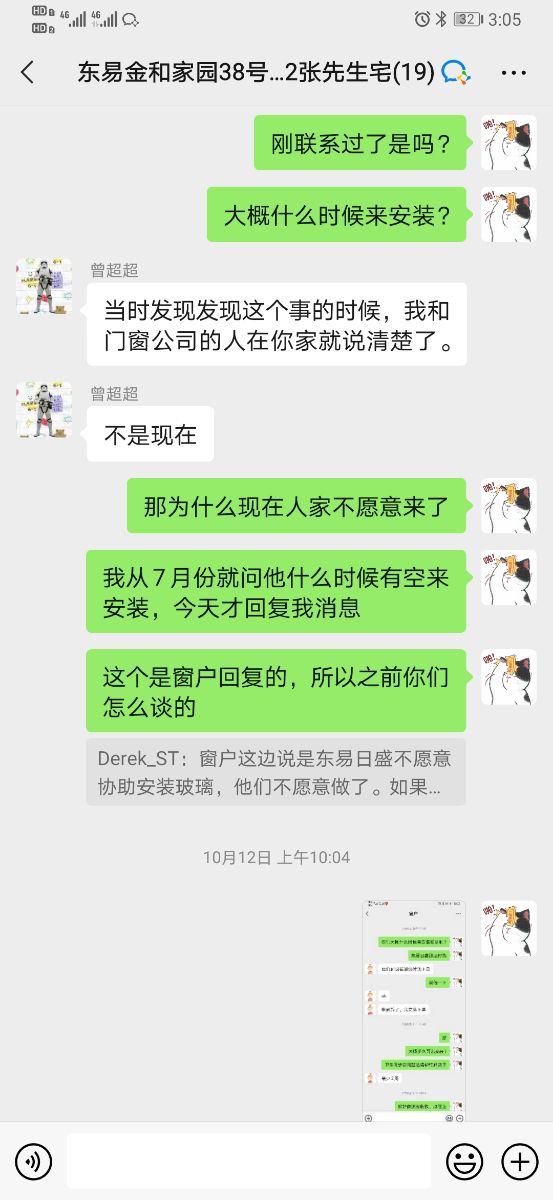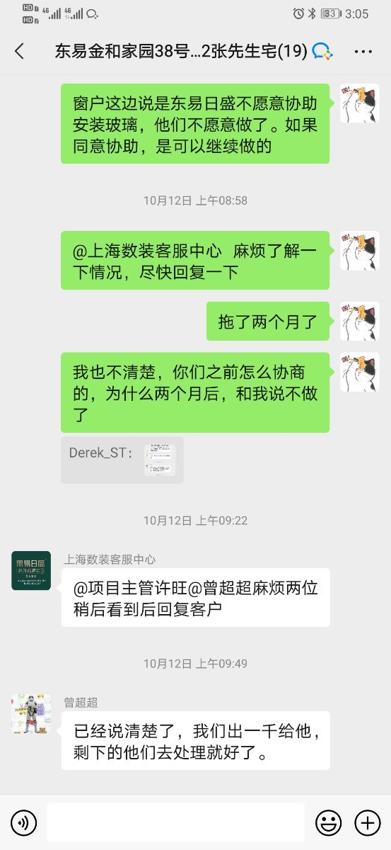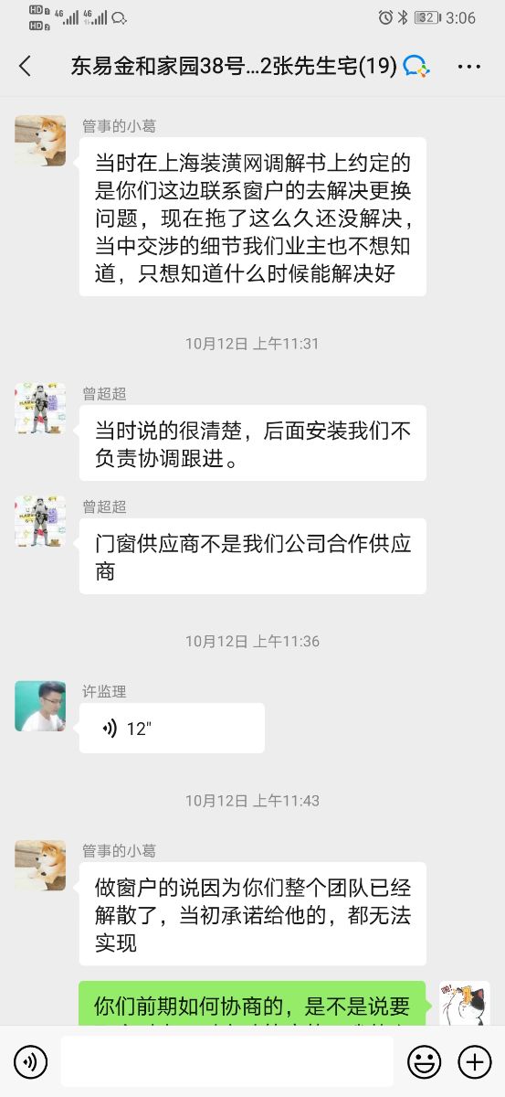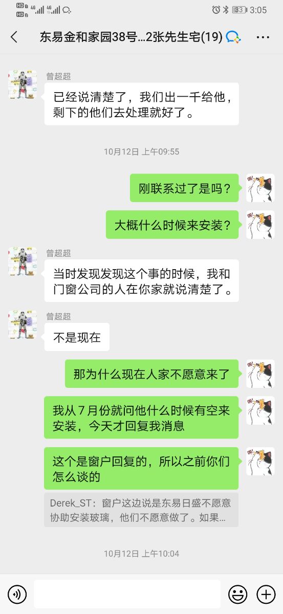 2023年7月8日,在裝潢網(wǎng)的幫助下,東易日盛結(jié)束了延期一年的業(yè)主家的裝修。但目前遺留了一個(gè)材料賠付的問題沒有解決,因此特向裝潢網(wǎng)反饋求助。東易日盛在裝修的過程中,損壞了業(yè)主家的兩扇窗戶。業(yè)主家窗戶是東易日盛設(shè)計(jì)師介紹的公司進(jìn)行安裝,不屬于東易日盛。因此,需要東易日盛、窗戶公司、業(yè)主三方進(jìn)行協(xié)商并處理好窗戶的賠付以及修理工作。東易日盛和窗戶公司在業(yè)主不知情的情況下,達(dá)成了口頭承諾:東易日盛以1000元付給窗戶公司,窗戶這邊同意更換破損的窗戶。該承諾并沒有書面證明,也沒有在業(yè)主知曉的情況下談妥。在2023年7月8日,東易日盛通知業(yè)主,已經(jīng)以1000元價(jià)格談好與窗戶這邊的修理工作。業(yè)主知曉后,第一時(shí)間詢問窗戶公司,窗戶公司同意更換,但一周之后窗戶公司失聯(lián)兩個(gè)月。這期間業(yè)主向東易日盛詢問情況,沒有得到反饋。兩個(gè)月后,窗戶公司回復(fù)業(yè)主,他們無(wú)法更換窗戶,1000元的價(jià)格超出了成本。并提供重要線索:東易日盛在1000元付給窗戶公司的同時(shí),也承諾會(huì)給窗戶公司更多的合作項(xiàng)目,并輔助窗戶公司完成業(yè)主家窗戶的修理工作。然而,東易日盛并沒有履行承諾,造成窗戶公司這邊損失。