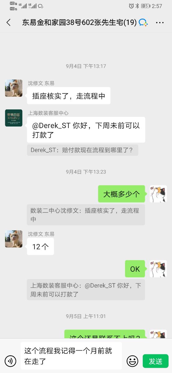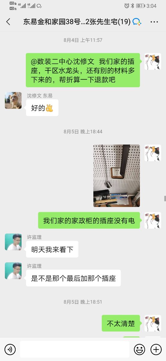 此外,根據(jù)裝修合同約定,裝修過程中,多余的材料費(fèi)需要退還給業(yè)主。業(yè)主多次向東易日盛提出清點(diǎn)多余材料并退款,然而在8.4日東易日盛在業(yè)主提醒下,計(jì)算了若干插座需要退款后,同意在9.4日之后的一周完成退款。但一直沒有執(zhí)行。業(yè)主反復(fù)多次催促,均無(wú)效果。